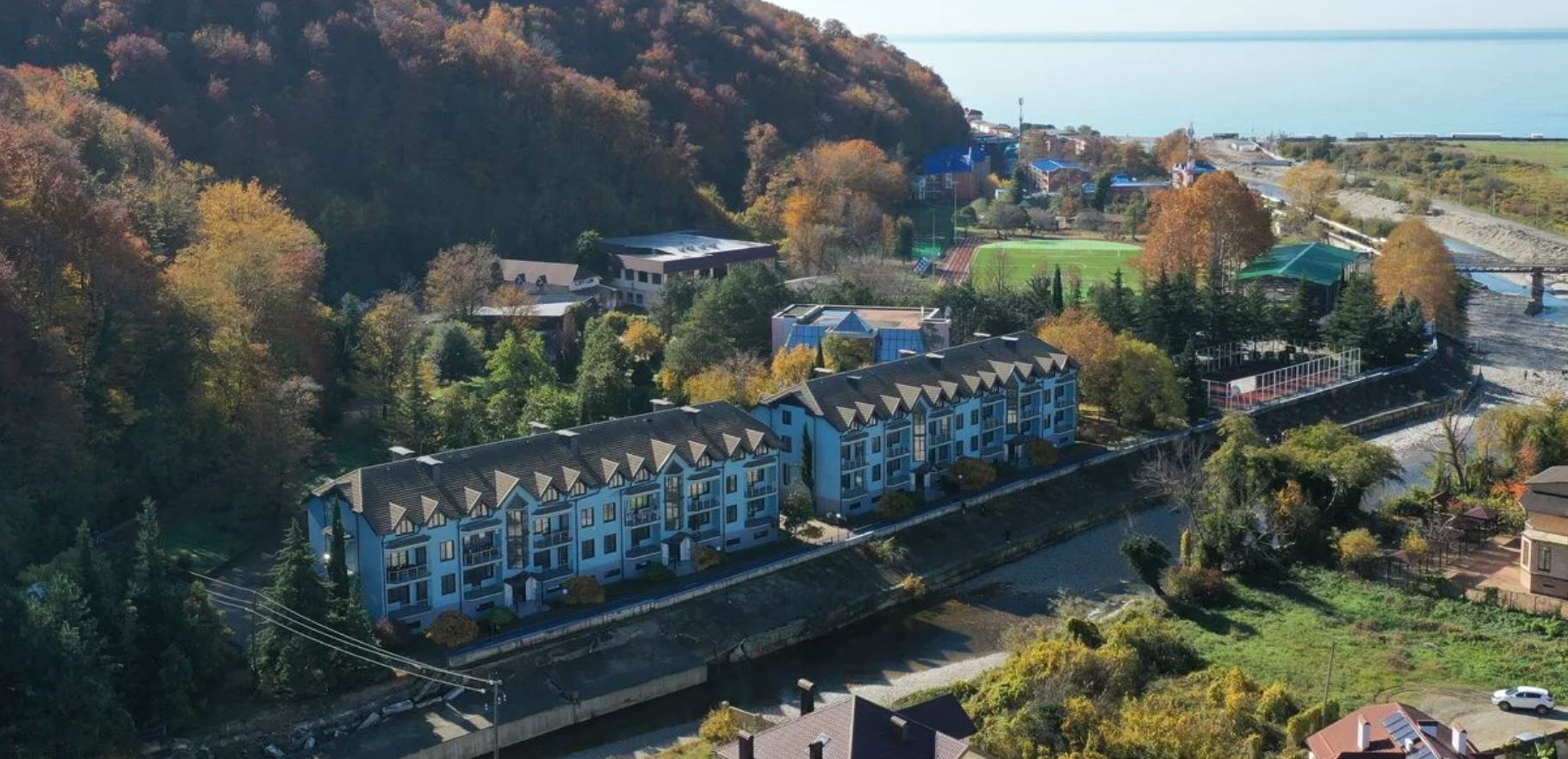 На территории комплекса спортивная и детская площадка.