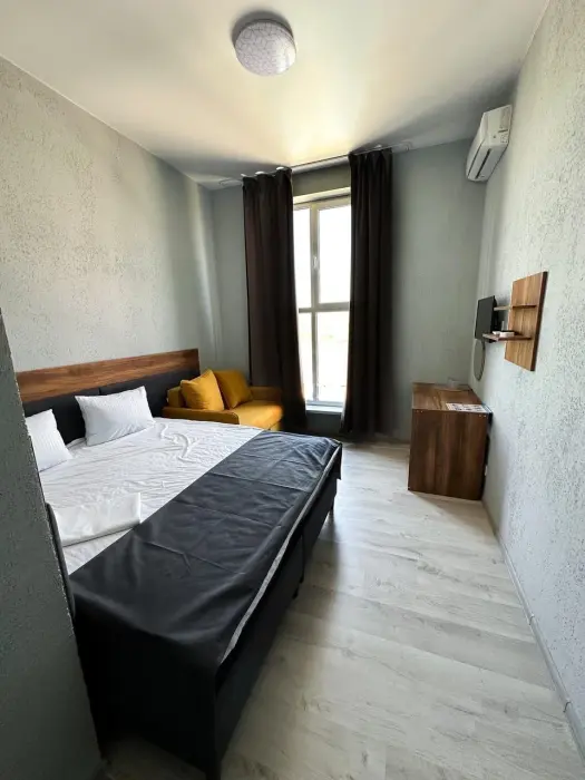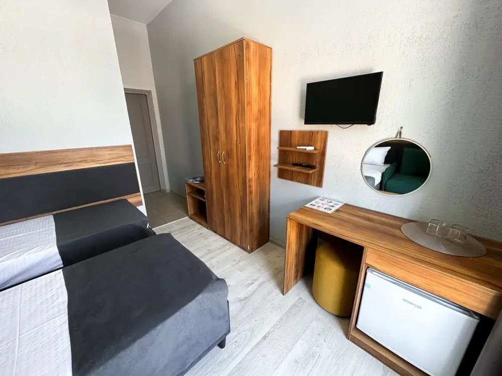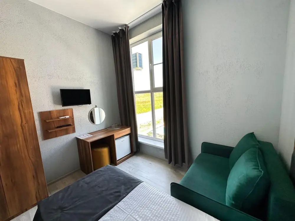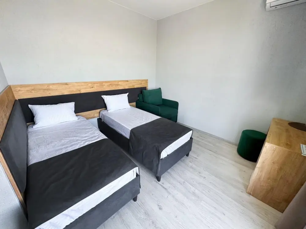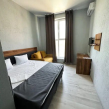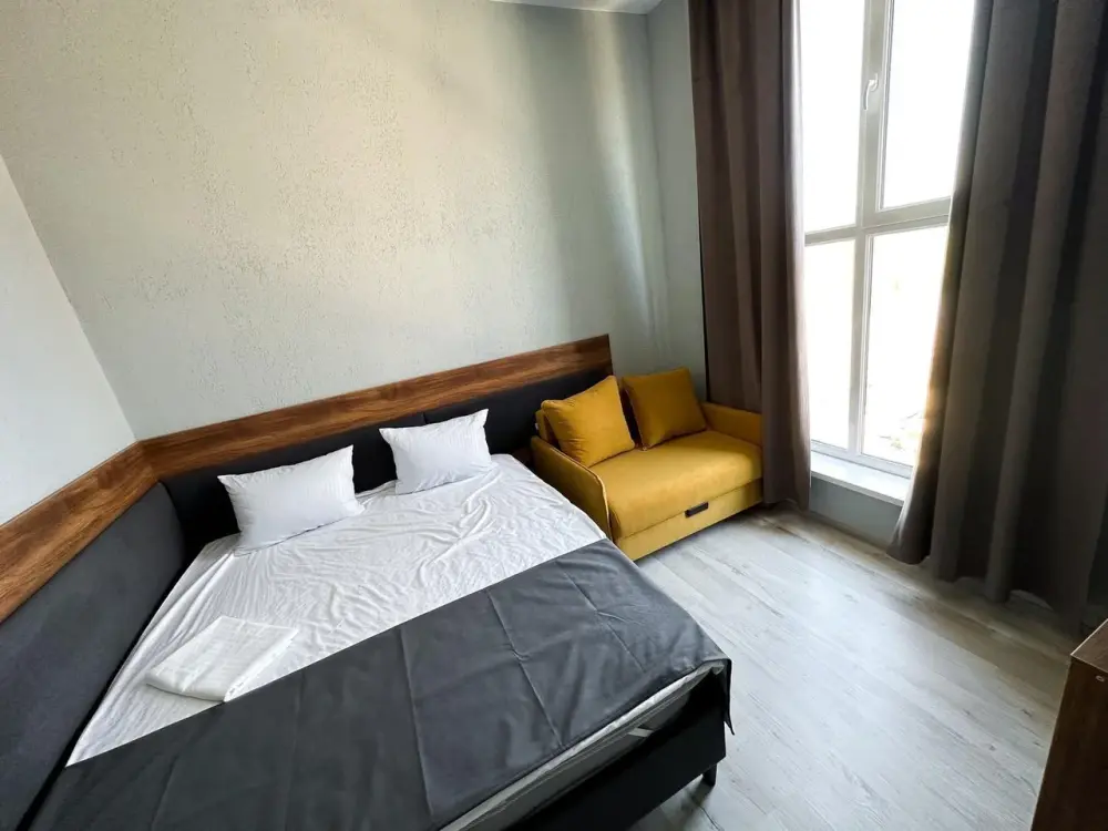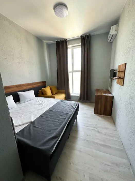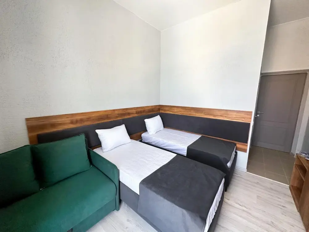Трехместный стандартный номер площадью 25 кв. м с видом во двор. Подходит для размещения 4 человек. (3 основных места и 1 дополнительное). Имеет спальню с приятным интерьером. В номере: 1 двуспальная кровать, 1 диван двуспальный.