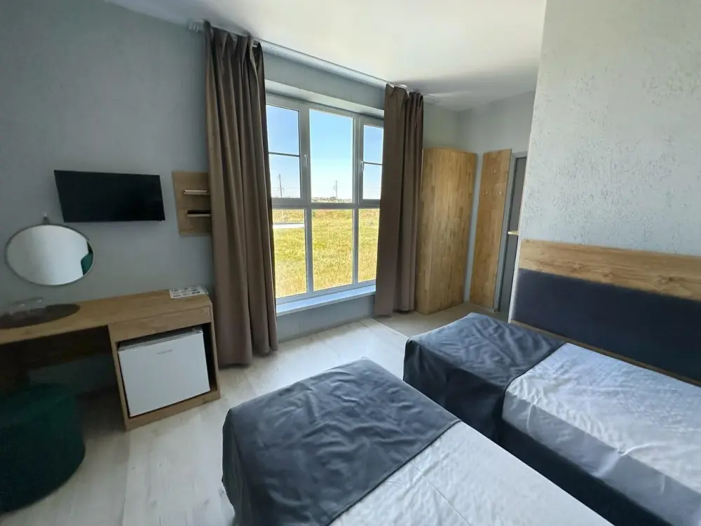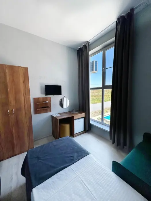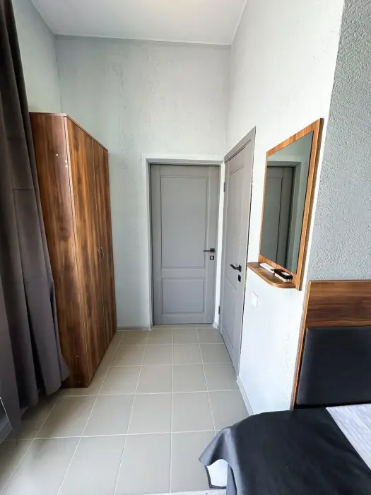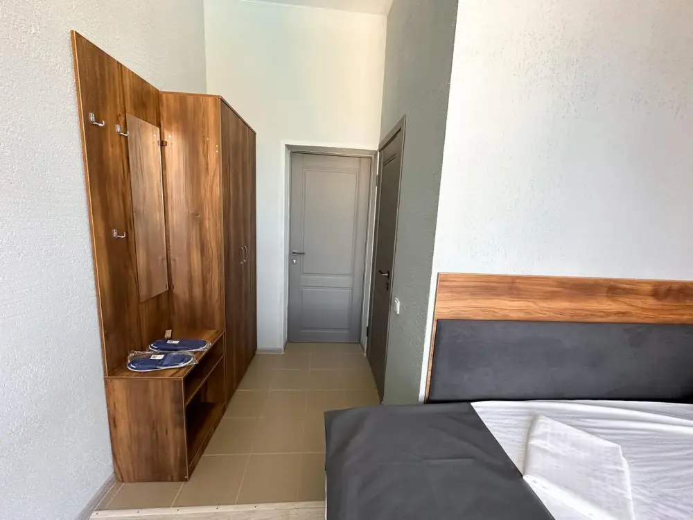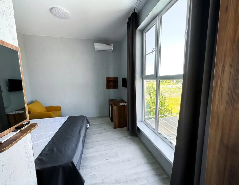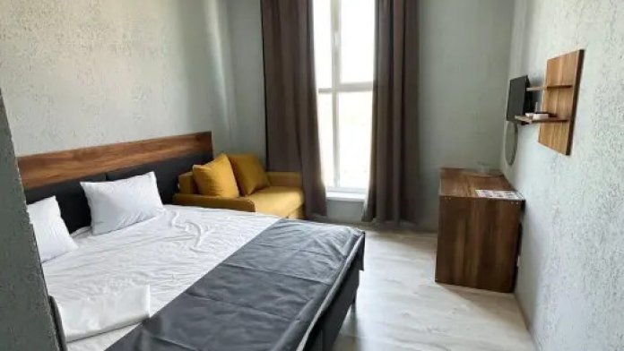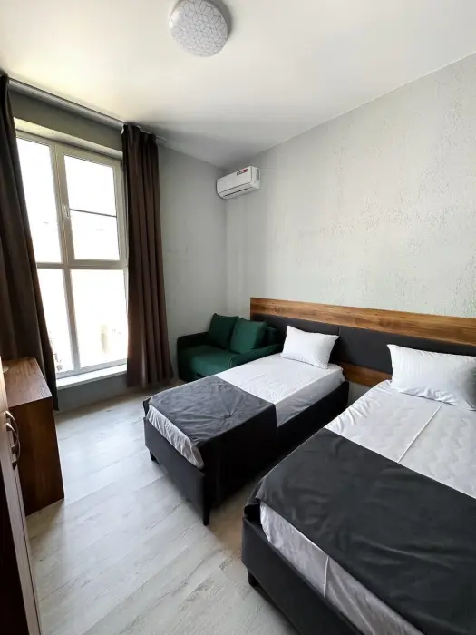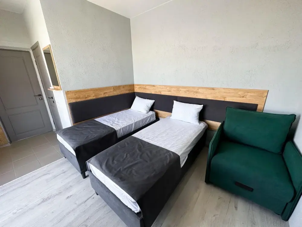 Трехместный стандартный номер площадью 25 кв. м с видом во двор. Подходит для размещения 4 человек. (3 основных места и 1 дополнительное). Имеет спальню с приятным интерьером. В номере: 1 двуспальная кровать, 1 диван двуспальный.