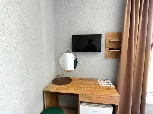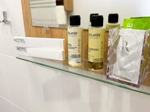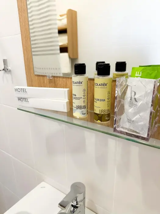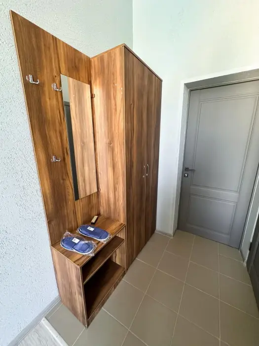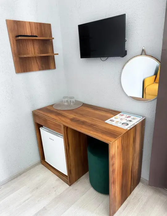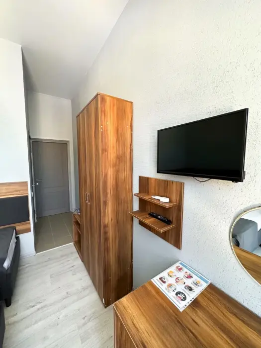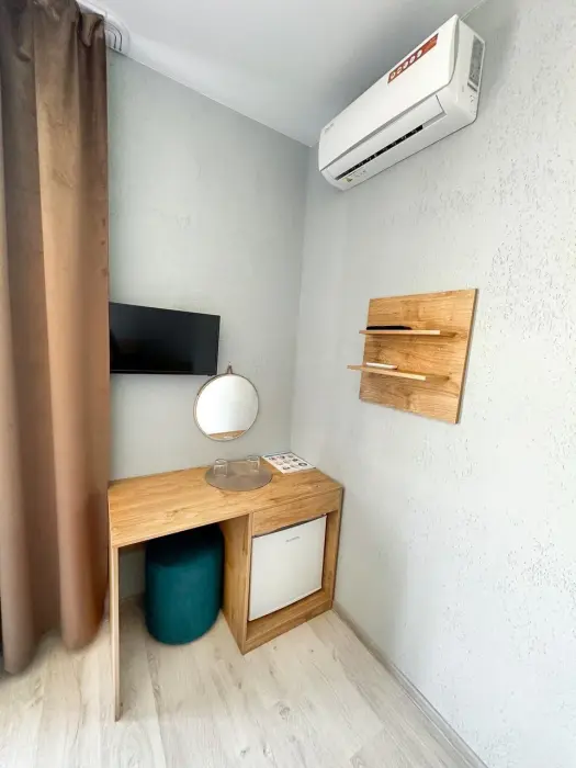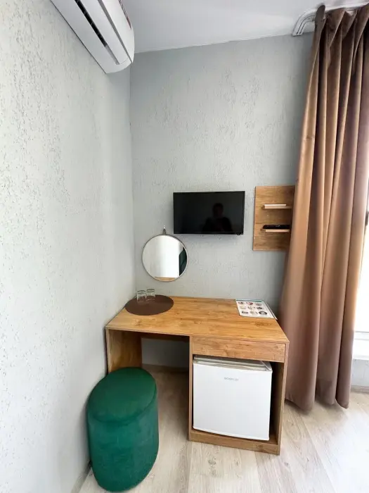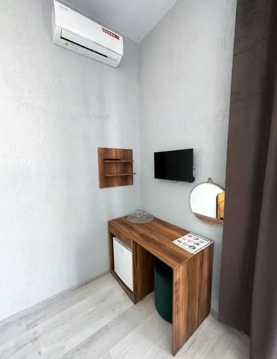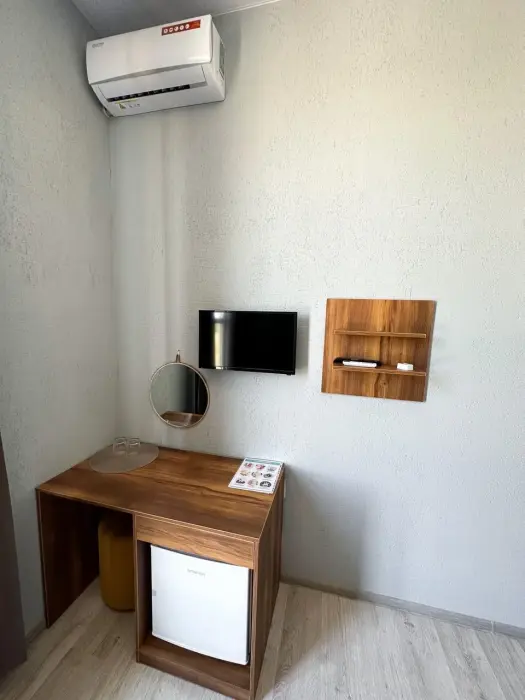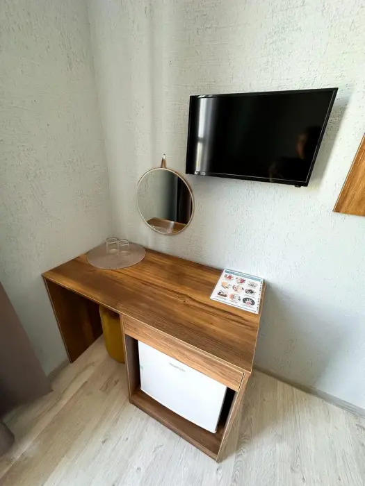 Имеется телевизор, кондиционер, вешалка, зеркало, рабочий стол, холодильник, стулья корзина для мусора. Индивидуальная ванная комната: душ, раковина, туалет, ванные принадлежности (шампунь, гель для душа, мыло, зубной набор).