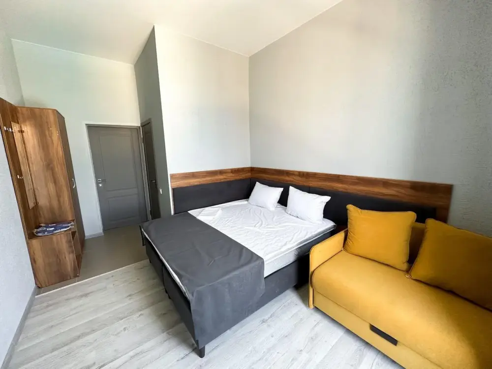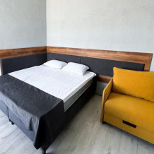Вип номер площадью 35 кв. м с видом во двор. Подходит для размещения 4 человек. Имеет спальню с приятным интерьером. В номере: 1 двуспальная кровать, 1 диван двуспальный.