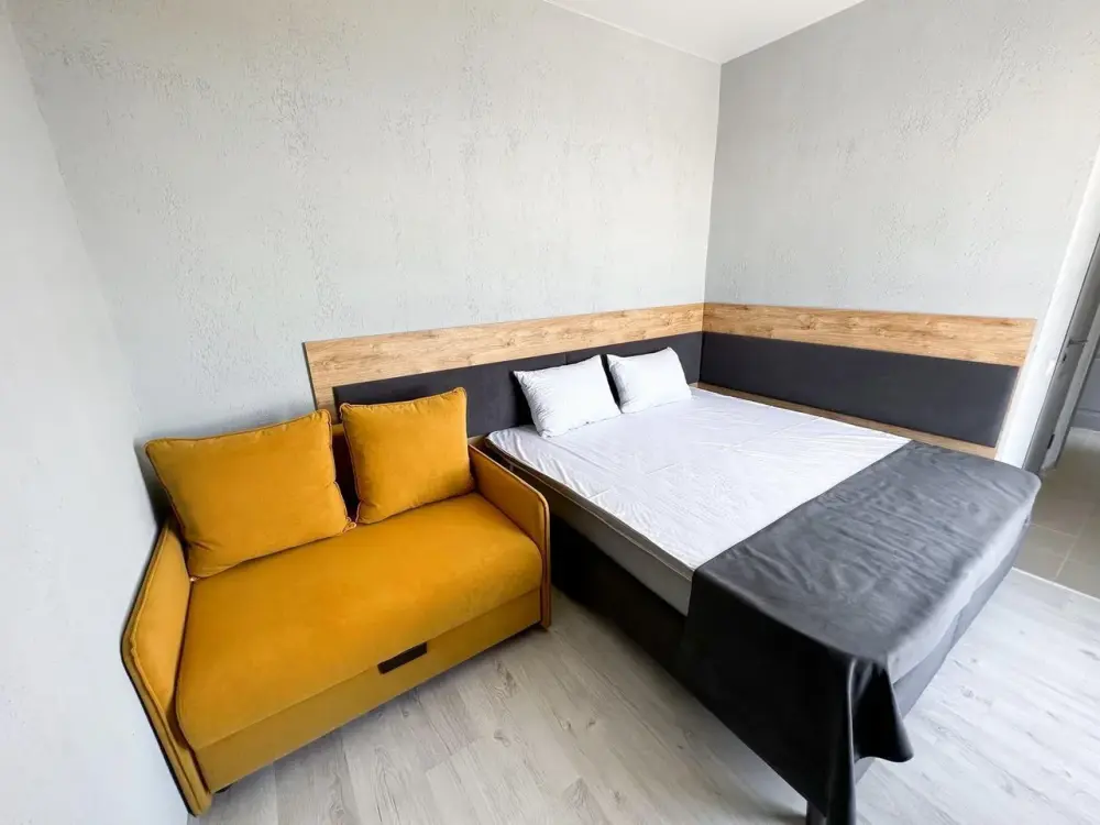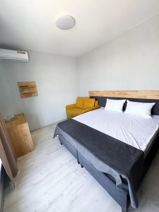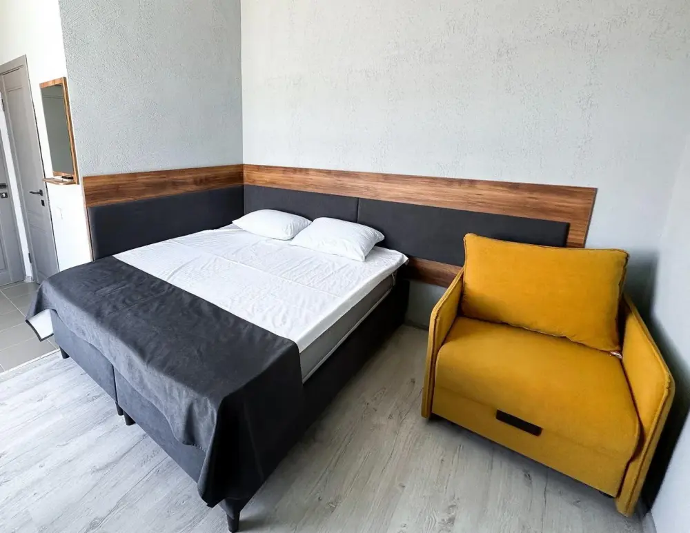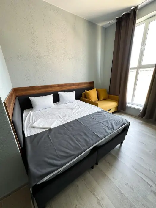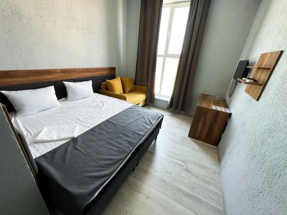Двухместный стандартный номер площадью 25 кв. м с видом во двор. Подходит для размещения 3 человек. (2 основных места и 1 дополнительное). Имеет спальню с приятным интерьером. В номере: 1 двуспальная кровать, 1 кресло-кровать.