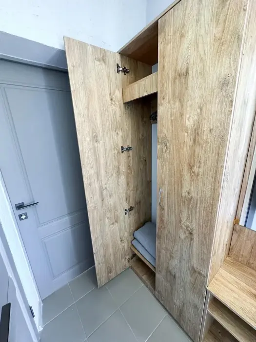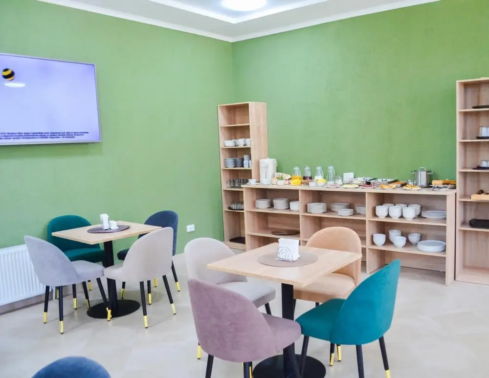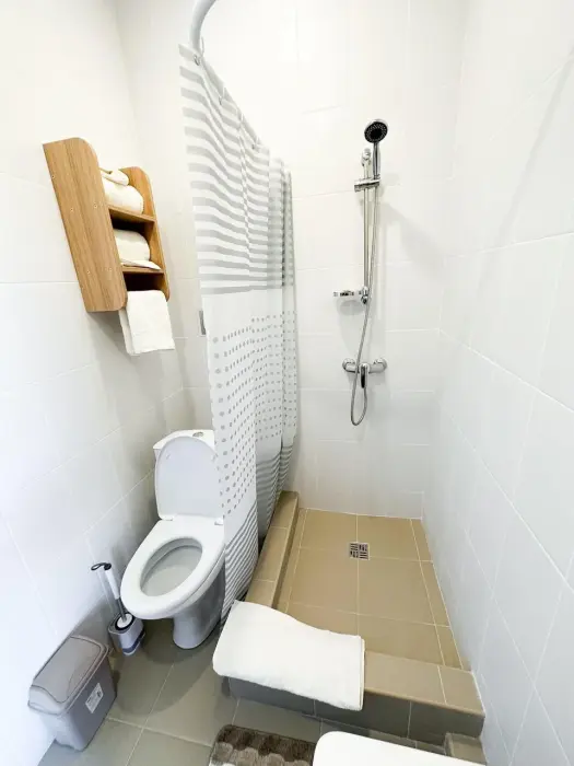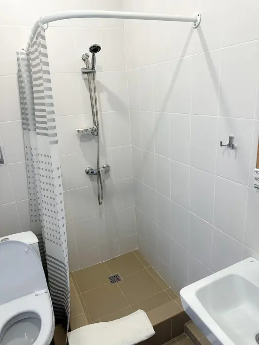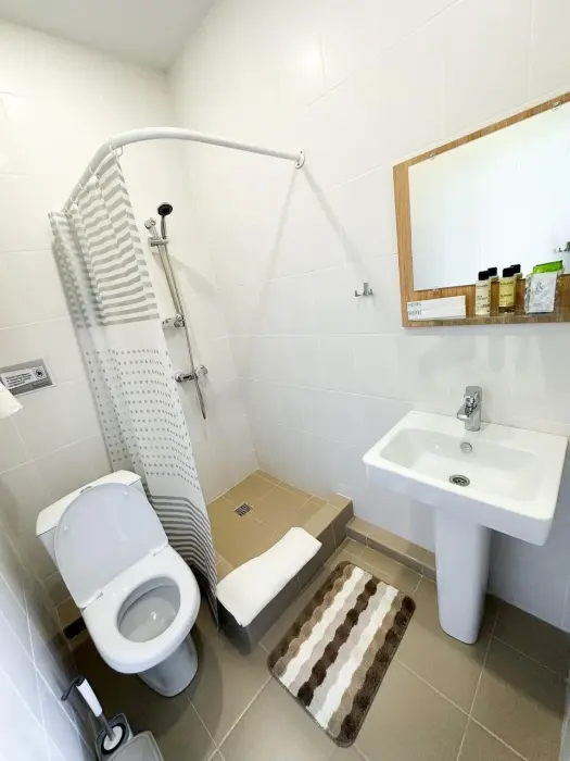 Имеется телевизор, кондиционер, вешалка, зеркало, рабочий стол, холодильник, стулья. Индивидуальная ванная комната: душ, раковина, туалет, ванные принадлежности (шампунь, гель для душа, мыло, зубной набор).