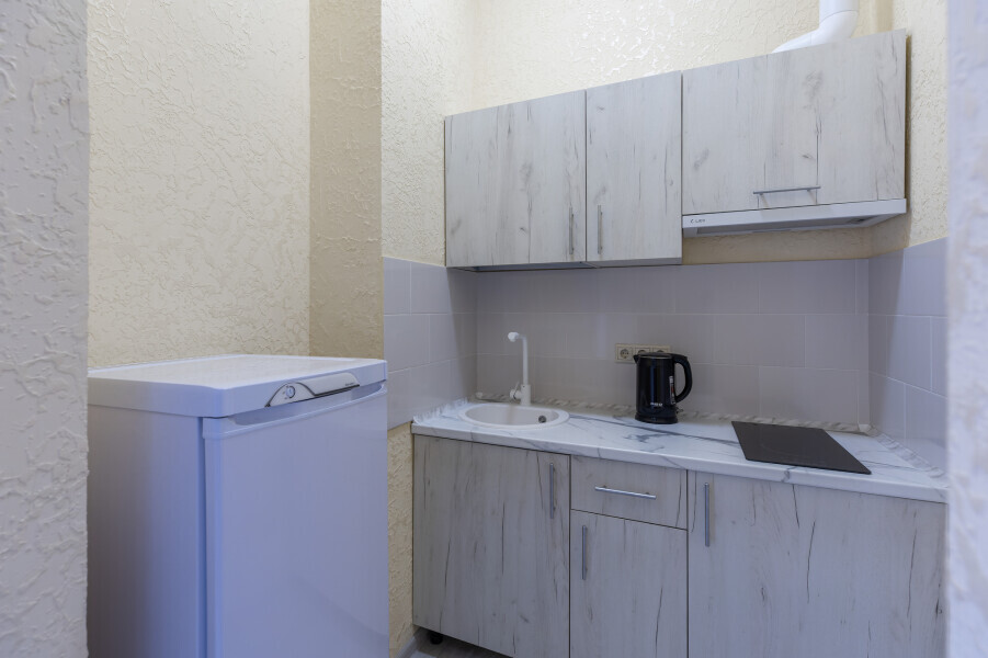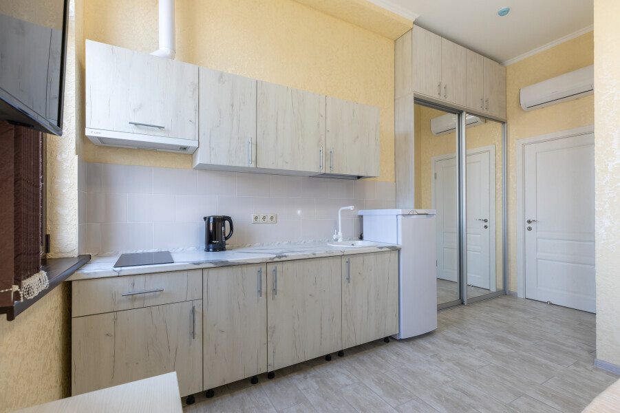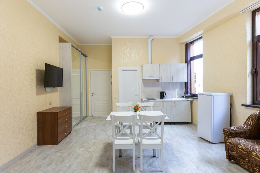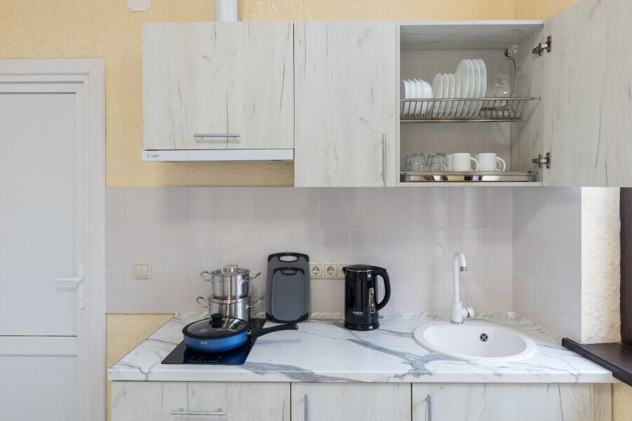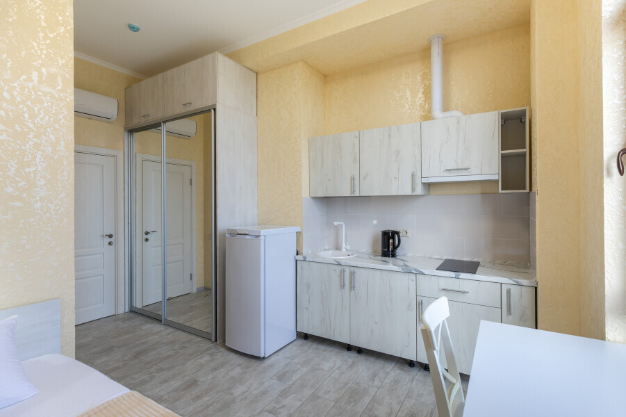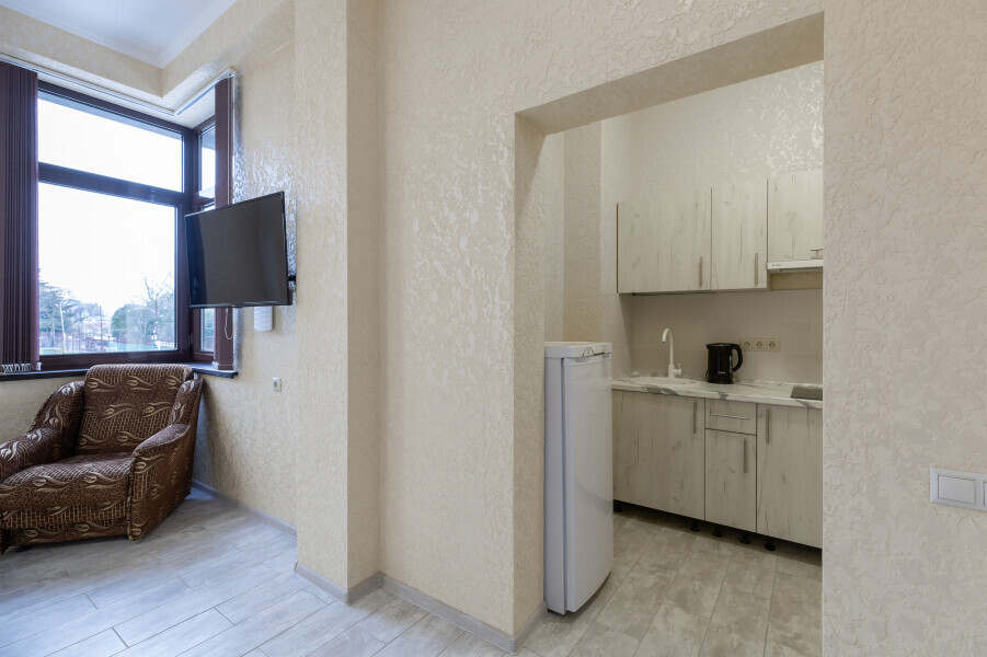 В номере имеется оборудованная всем необходимым кухня. Холодильник, кухонная мебель и посуда помогут самостоятельно организовать питание.