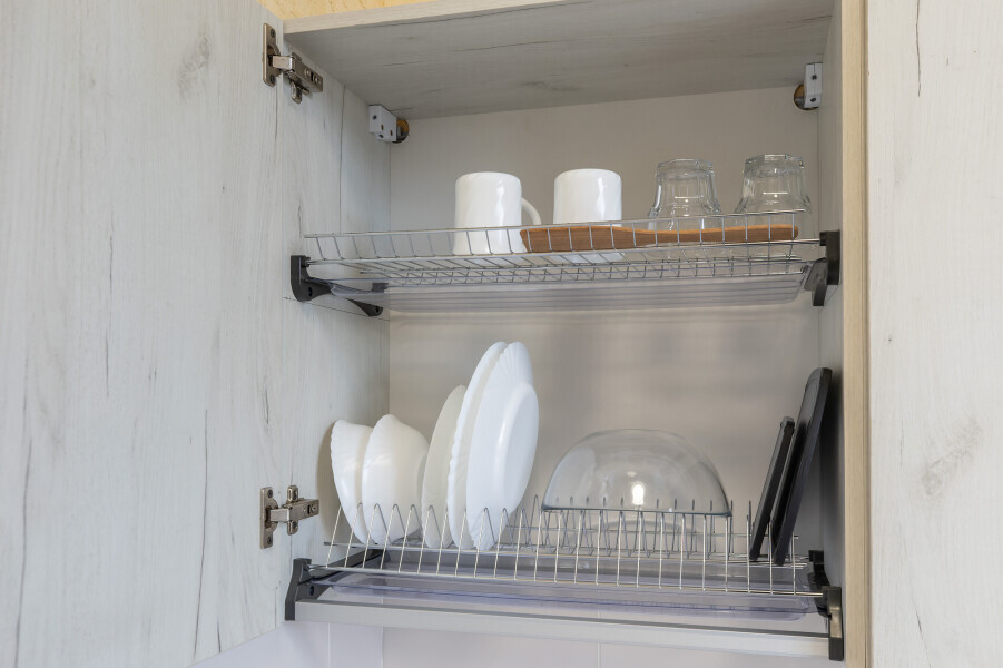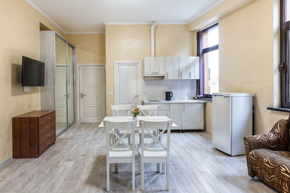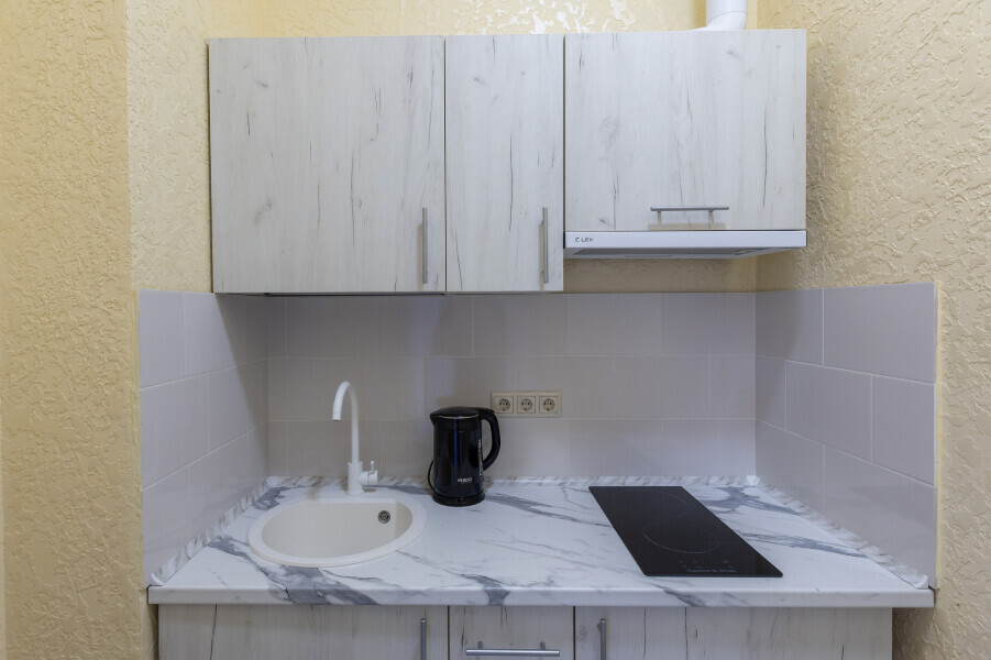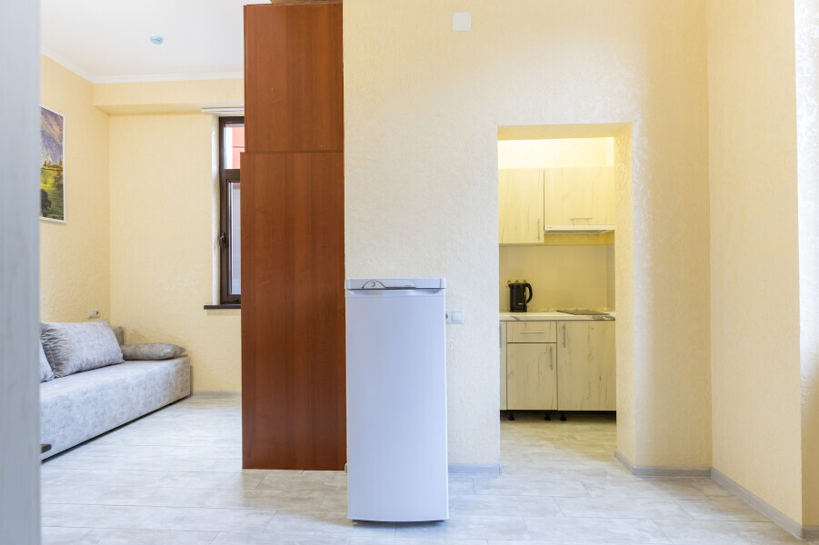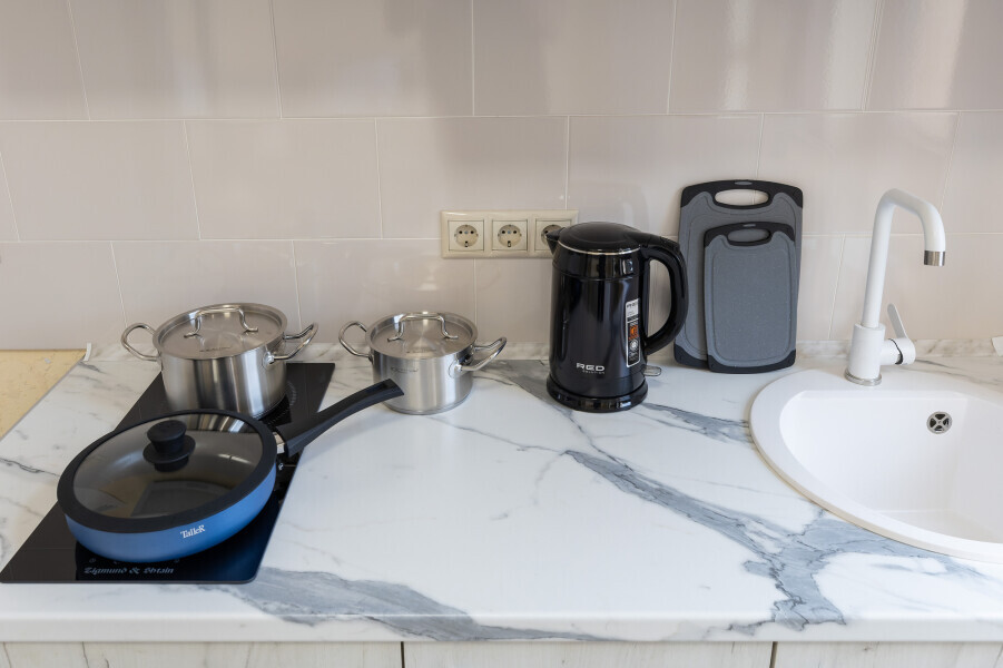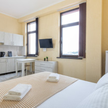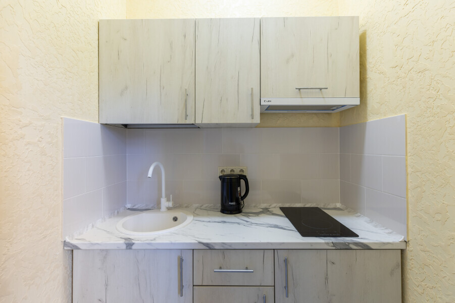 В номере имеется оборудованная всем необходимым кухня. Холодильник, кухонная мебель и посуда помогут самостоятельно организовать питание.