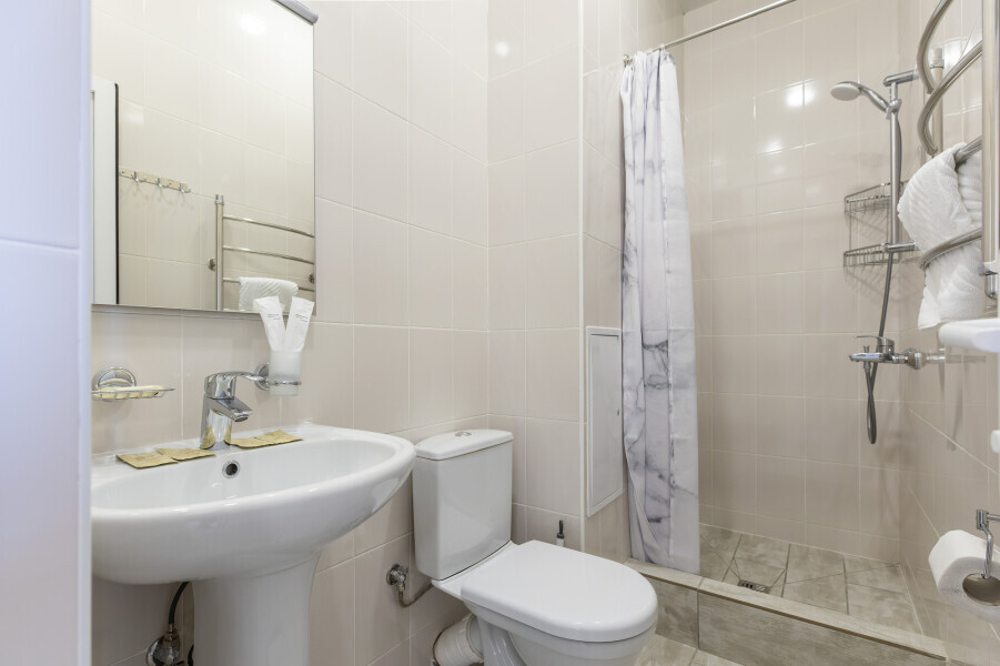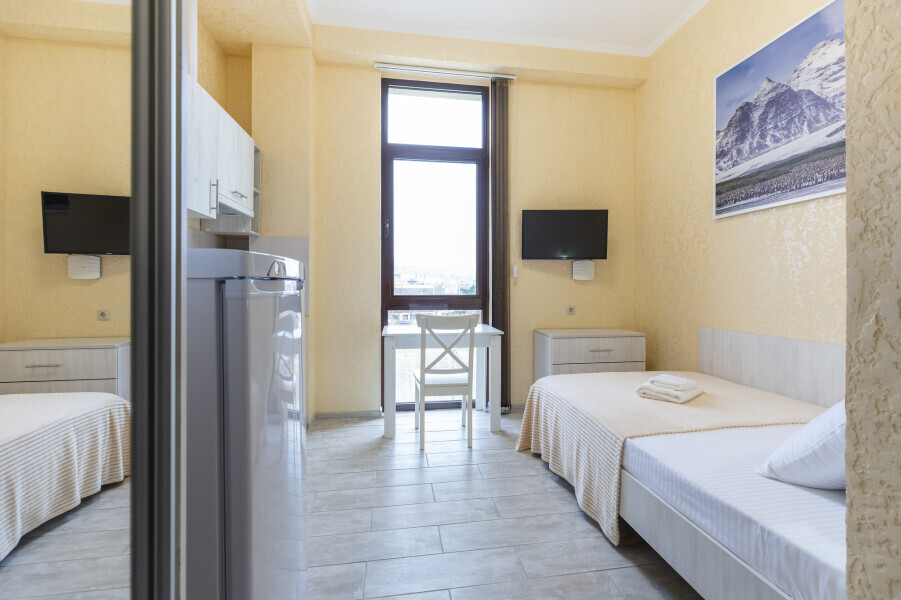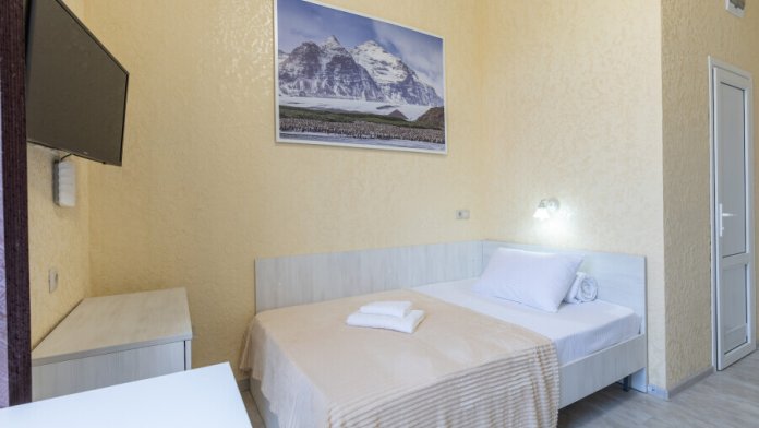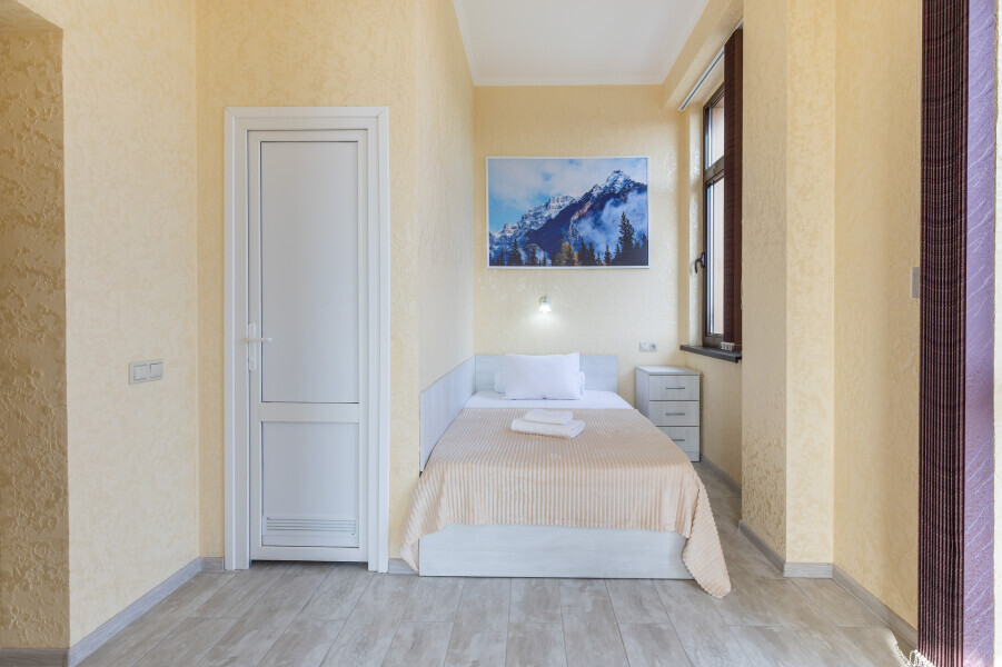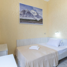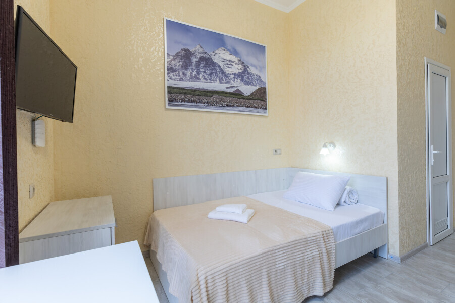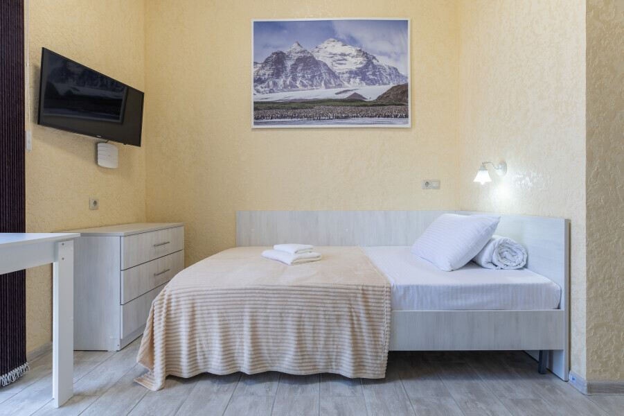 Уютный номер оснащен 1,5-спальной кроватью, которая обеспечит Вам отличный сон и отдых после активного дня. А кондиционер, холодильник, ЖК телевизор и собственный санузел с душем обеспечат Ваше удобство.