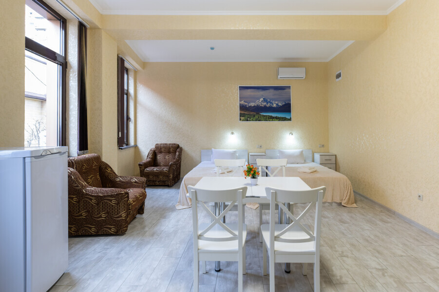 Комфортабельный двухкомнатный номер оснащен двумя двуспальными кроватями и раскладным креслом для полноценного отдыха. Так же в номере имеется кондиционер, холодильник, ЖК телевизор и собственный санузел с душем, которые обеспечат максимальное удобство.