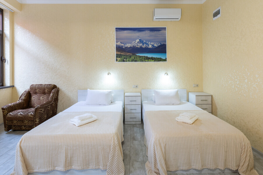 Номер оснащен двумя отдельными кроватями и двумя раскладными креслами. Данная конфигурация подходит для семьи или небольших компаний. Так же в номере имеется кондиционер, холодильник, ЖК телевизор и собственный санузел с душем, которые обеспечат максимальное удобство.