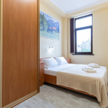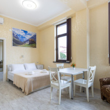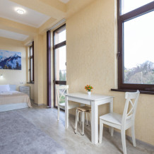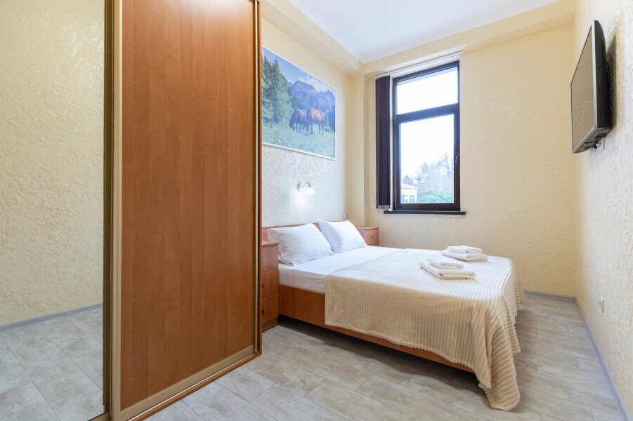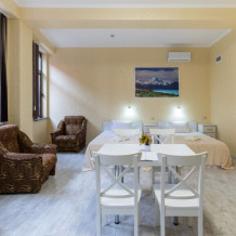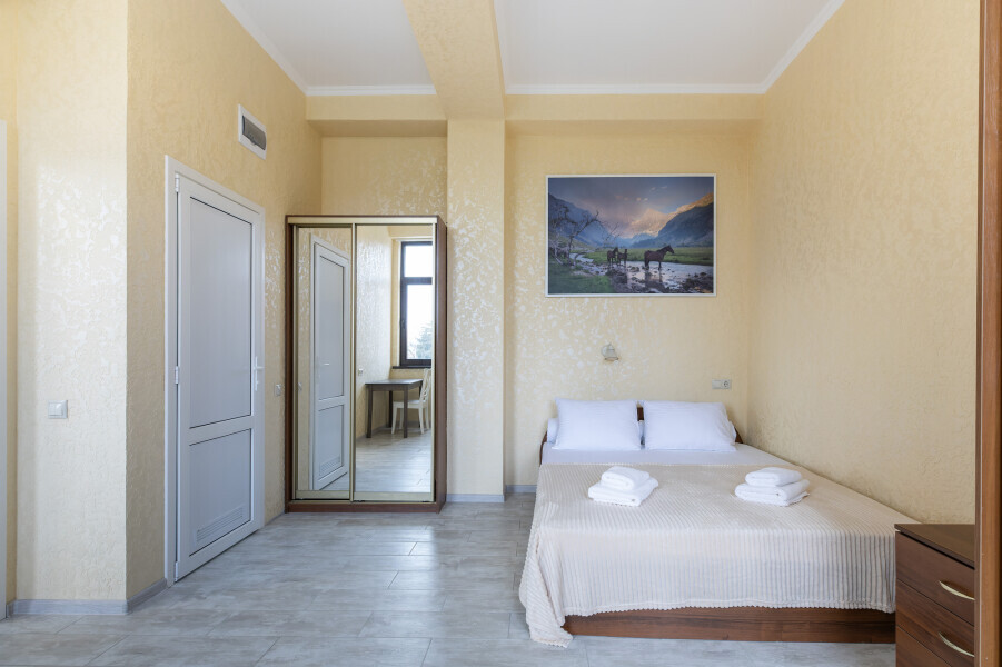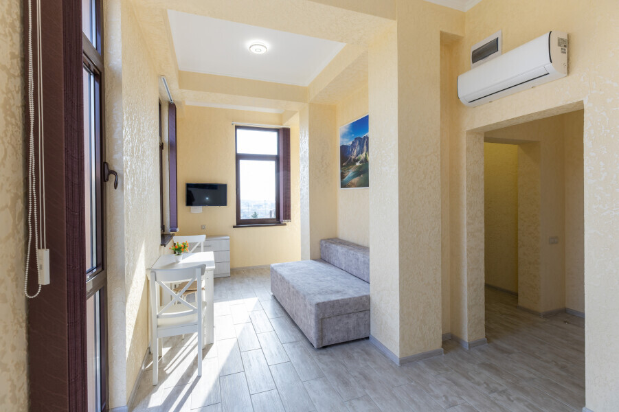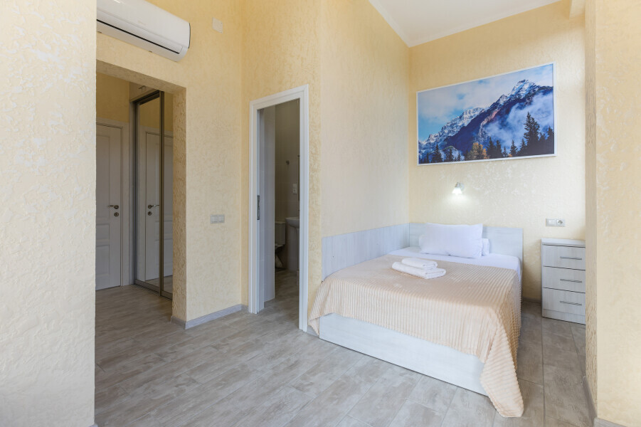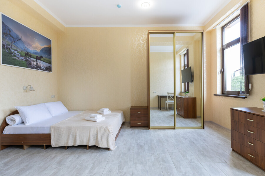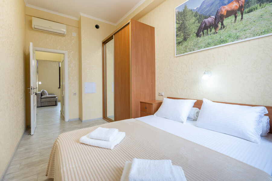 Двухкомнатный просторный номер оснащен двуспальной кроватью и двухместным раскладным диваном. Так же в номере имеется кондиционер, холодильник, ЖК телевизор и собственный санузел с душем, которые обеспечат максимальное удобство.