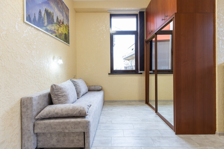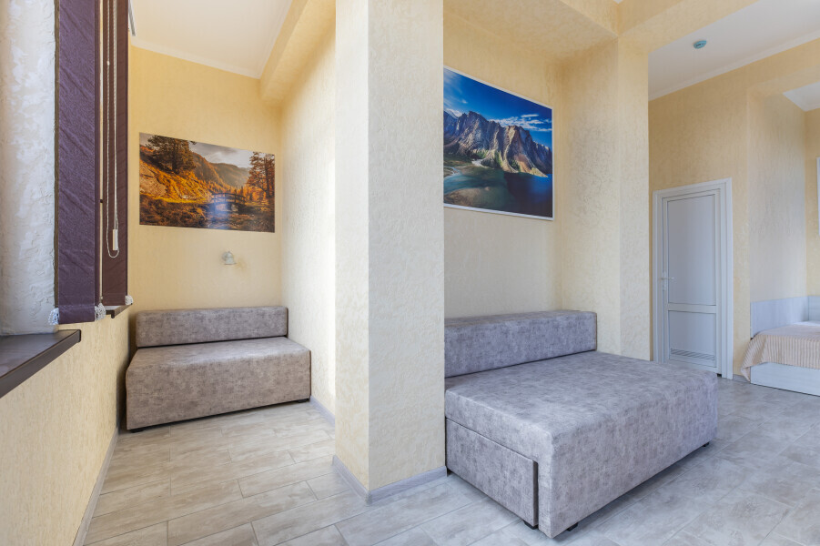 Просторный уютный номер оснащен 1,5-спальной кроватью, двухместным диваном и одноместным диваном. Данная конфигурация идеально подходит для семьи. Так же в номере имеется кондиционер, холодильник, ЖК телевизор и собственный санузел с душем, которые обеспечат максимальное удобство.