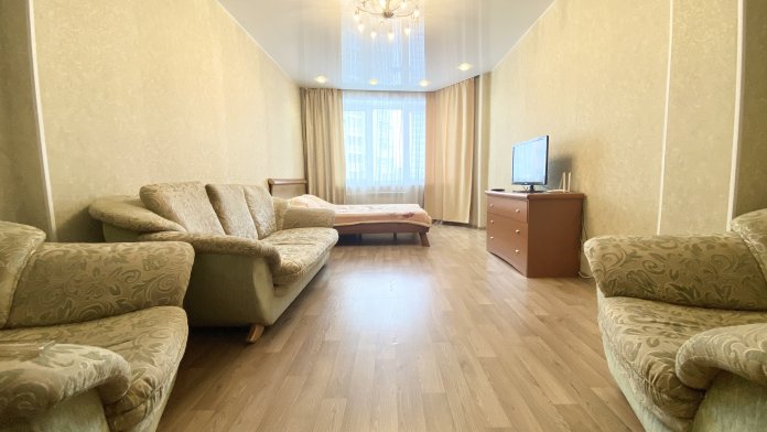 В квартире: двуспальная кровать, диван-кровать, стол, журнальный столик, ТВ (кабельное 105 каналов), Wi-Fi, безлимитный интернет. Чистое постельное белье, полотенца, (в стоимость входит 1 комплект) гладильная доска, сушилка, утюг. Пол квартиры покрыт линолеумом, в окнах установлены пластиковые стеклопакеты. Кухня оснащена: кухонный гарнитур, электрическая и микроволновая печи, эл. чайник, холодильник, сделают приготовление любимой пищи максимально комфортным. Комплект посуды - по количеству проживающих. Ванная комната: Ванна/душ, фен по запросу.