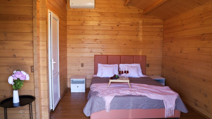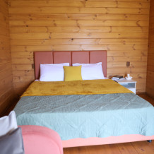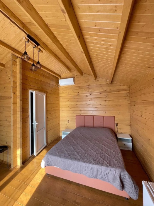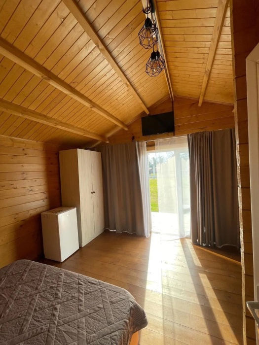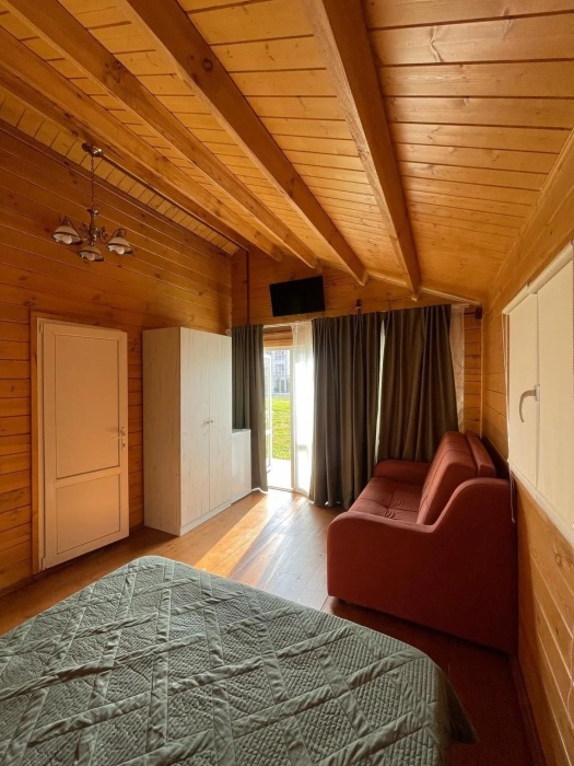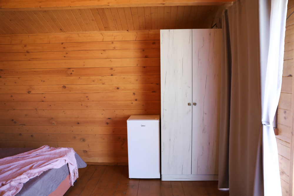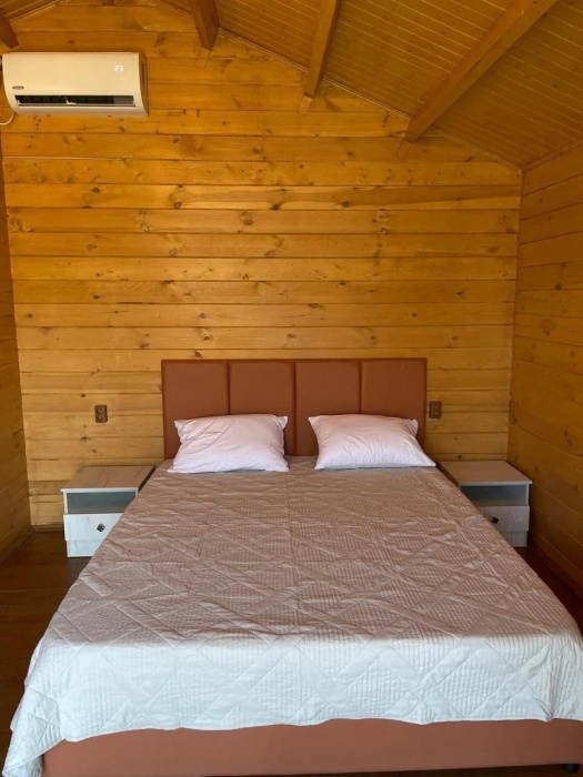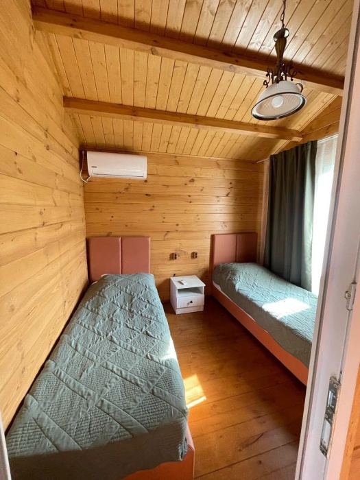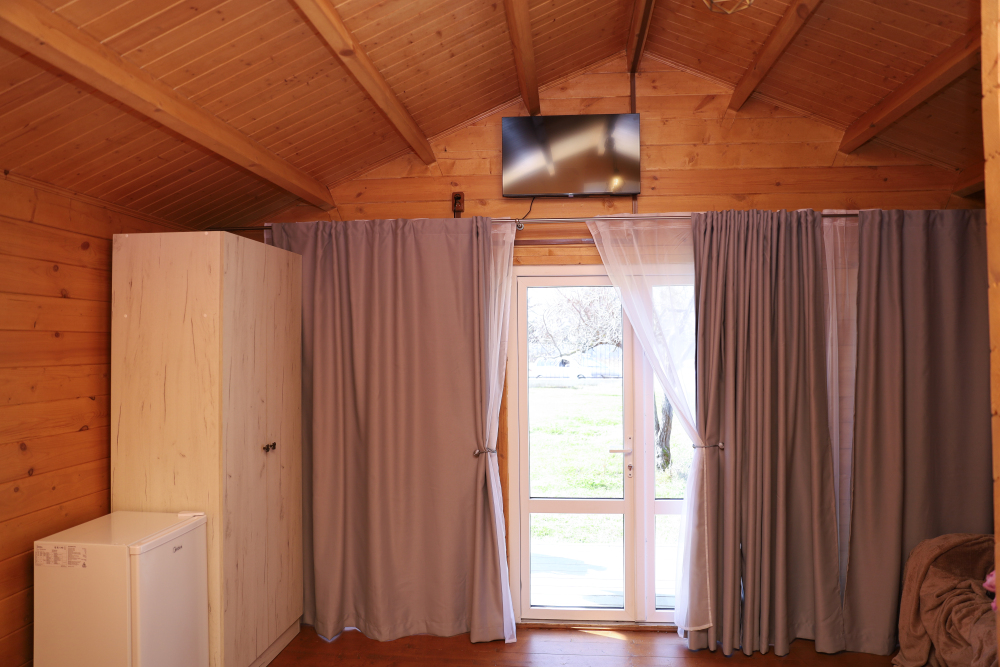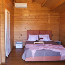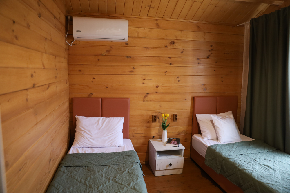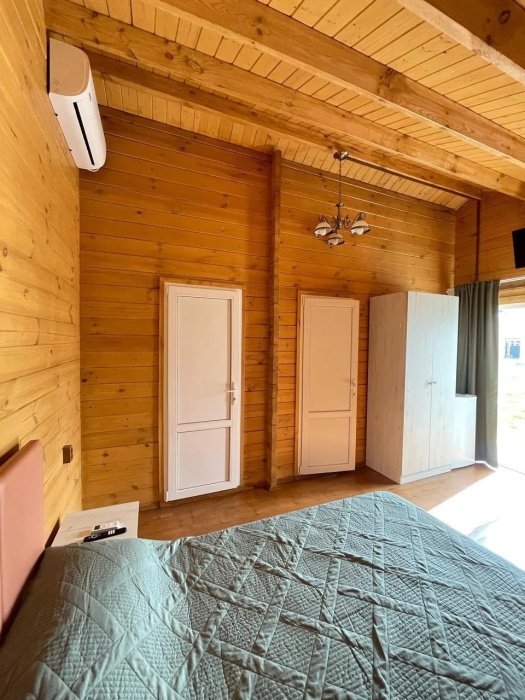 Для наших гостей мы предлагаем коттеджные двухкомнатные и однокомнатные домики, полностью оборудованные для комфортного проживания. В каждом домике есть фен, холодильник, гладильные принадлежности. В домике есть ТВ, WI-FI, также имеется кондиционер и просторная ванная комната. У каждого домика есть своя веранда.