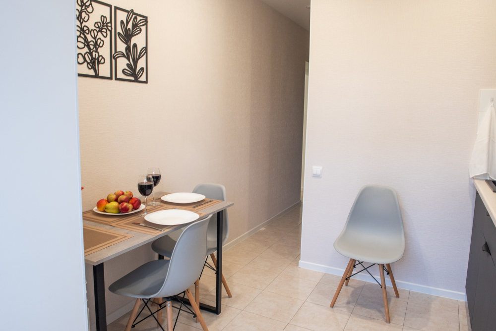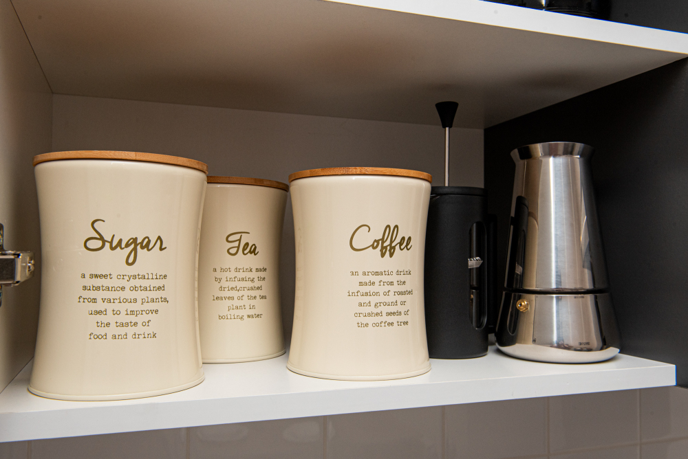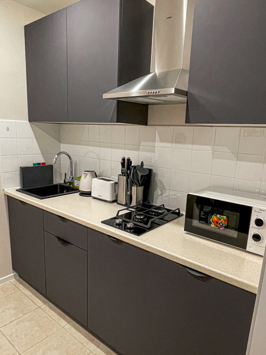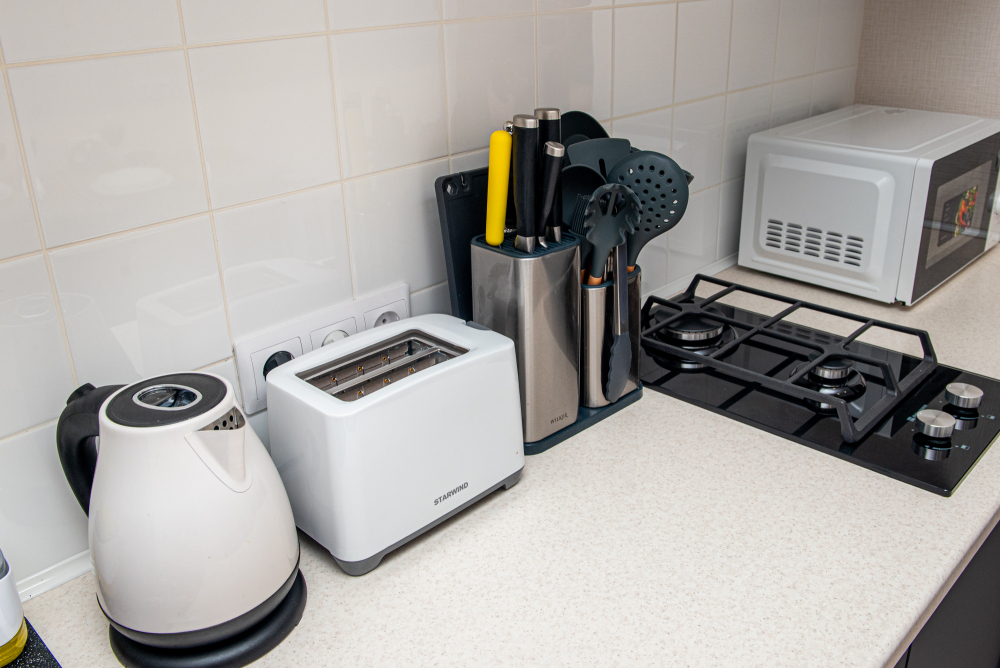 - полностью оснащенная кухня (микроволновая печь, варочная панель, чайник, тостер, кофеварка, набор посуды для готовки, тарелки, чашки, столовые приборы, стаканы, бокалы), чай, кофе, сахар и другие мелочи.