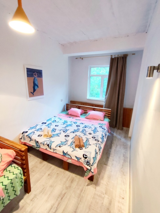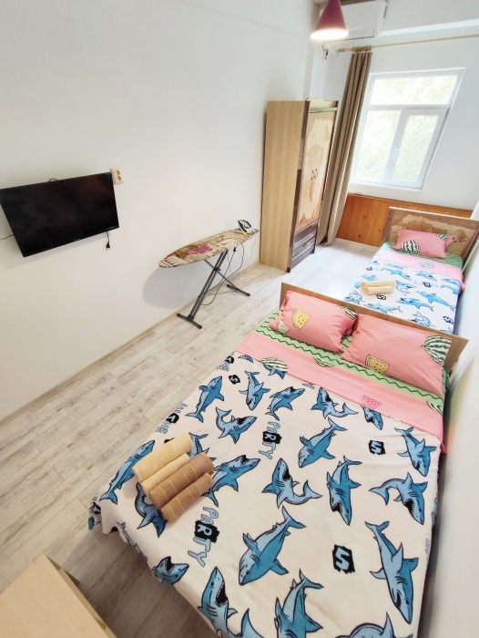 6 спальных мест (двухспальные кровати - 2 шт., односпальные кровати -2 шт.). Wi-Fi, смарт ТВ, стиральная машина, 2 кондиционера, холодильник, плита с духовкой, гладильная доска, утюг, фен, водонагреватель.