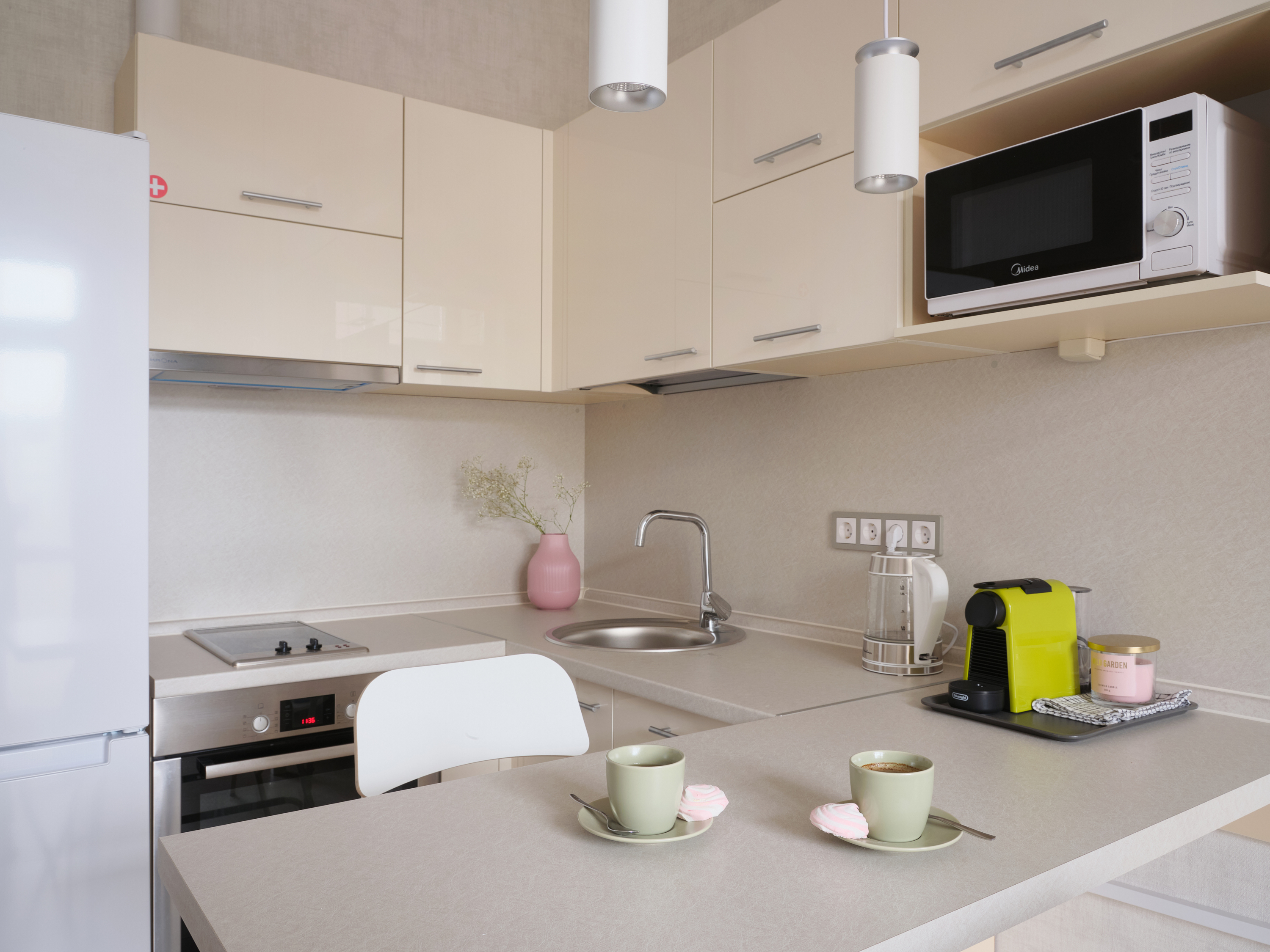 кухня с плитой, холодильником, чайником, кофемашиной;