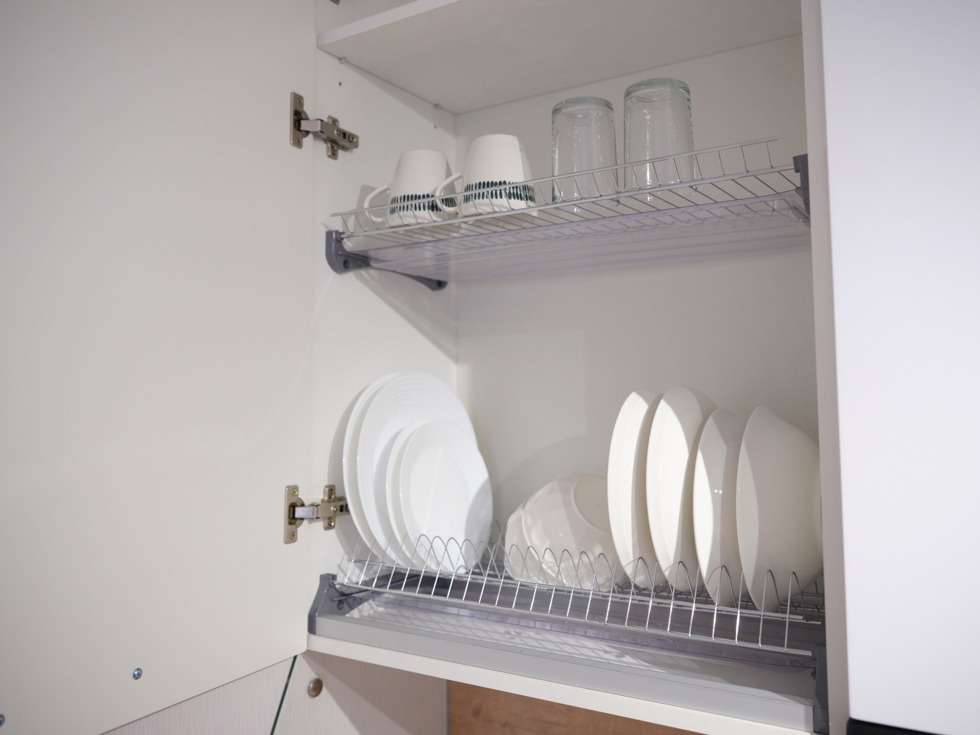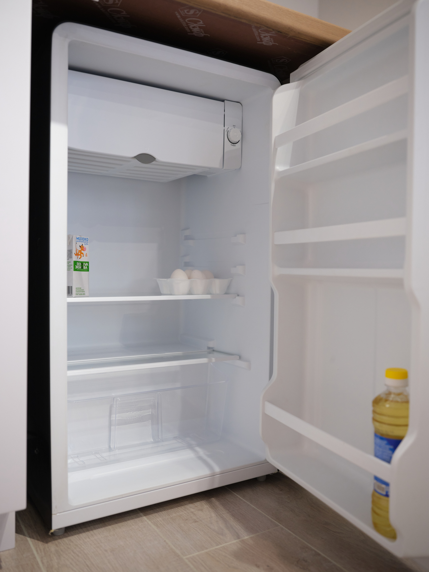 кухня с плитой, холодильником, чайником, кофемашиной;