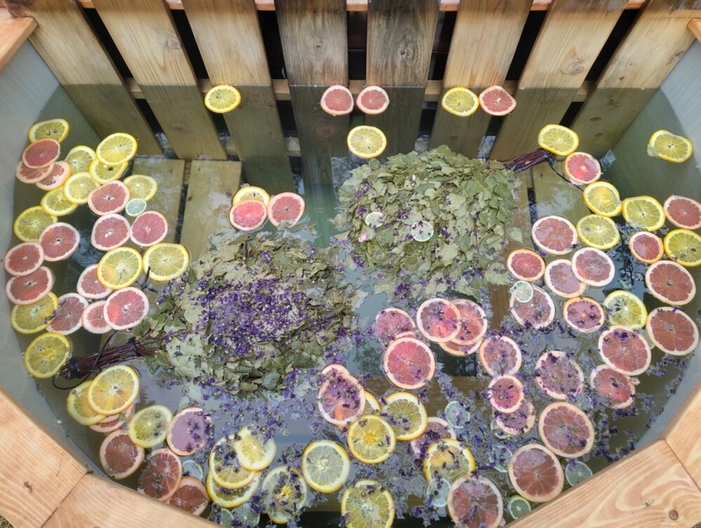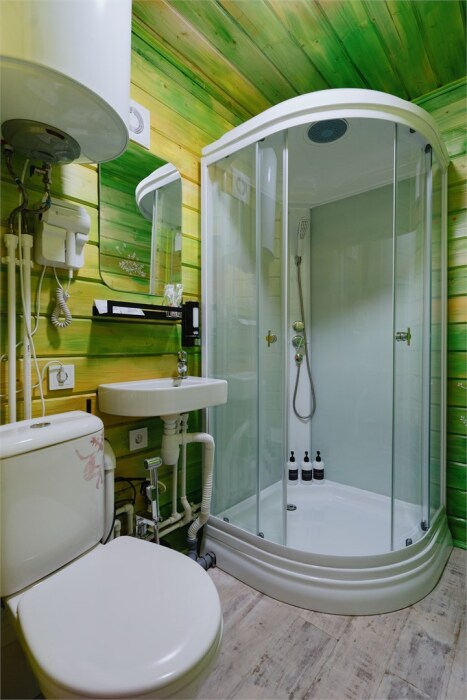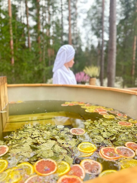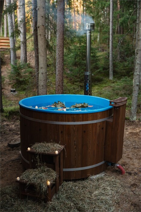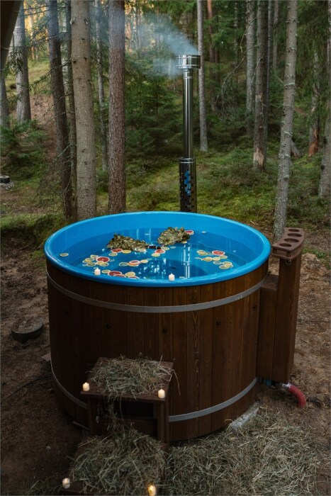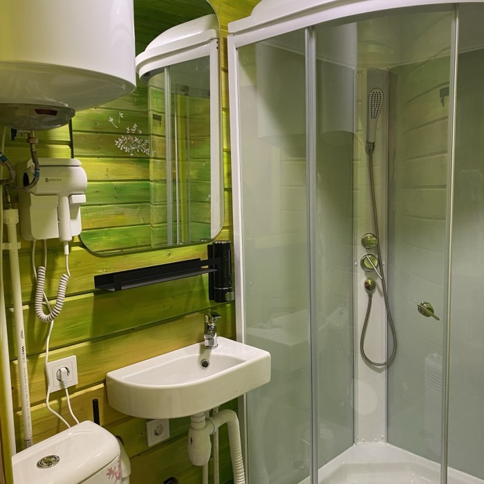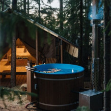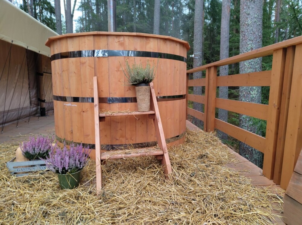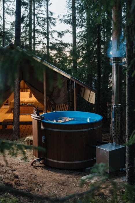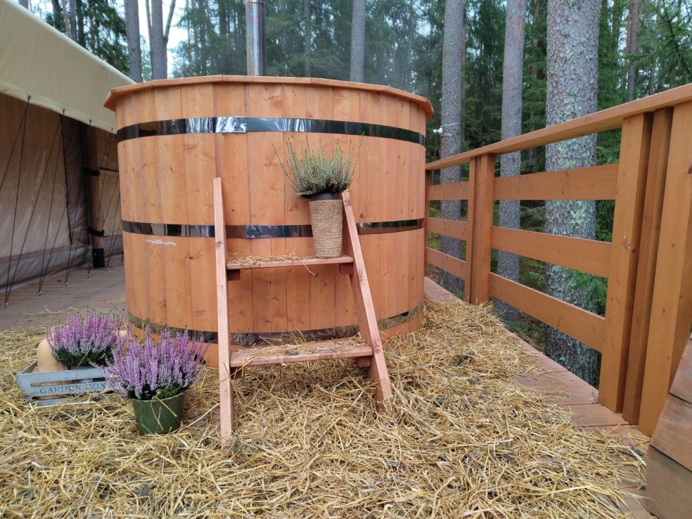 Внутри — king‑size кровать, тёплый пол, санузел и кухонный уголок. Снаружи — собственная терраса, купель( 1 топка купели входит в пакет проживания от 2-х ночей), мангальная зона и вид на сосновый лес