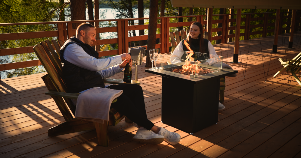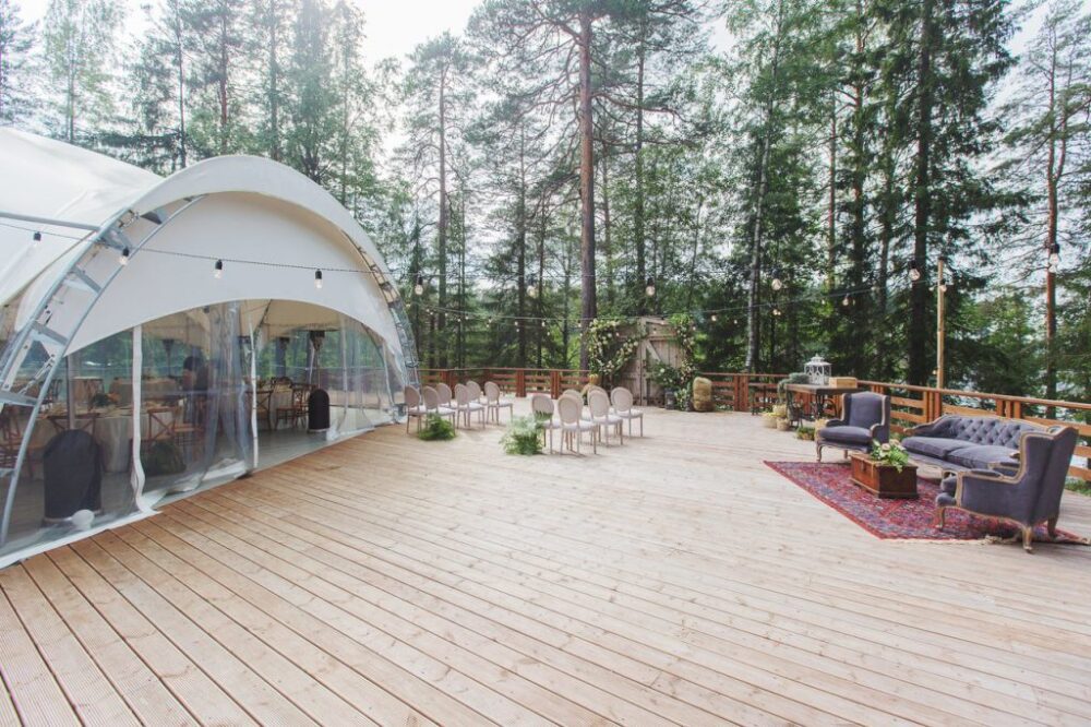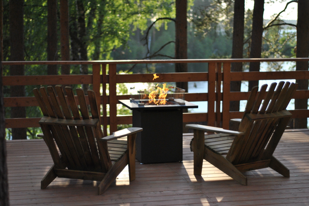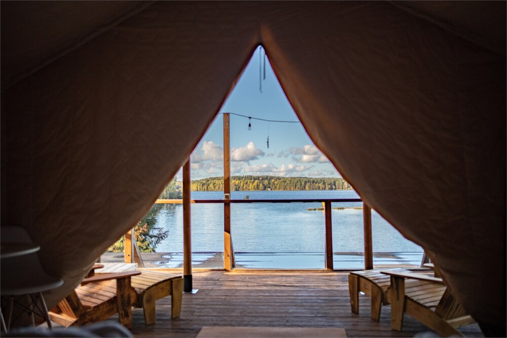 Индивидуальная терраса с двумя лоджами, идеально для семьи и для компаний. В вашем распоряжении огромная терраса и потрясающий вид на озеро, персональный камин, ваша личная купель (бронируется дополнительно), возможность заказать блюда из ресторана.