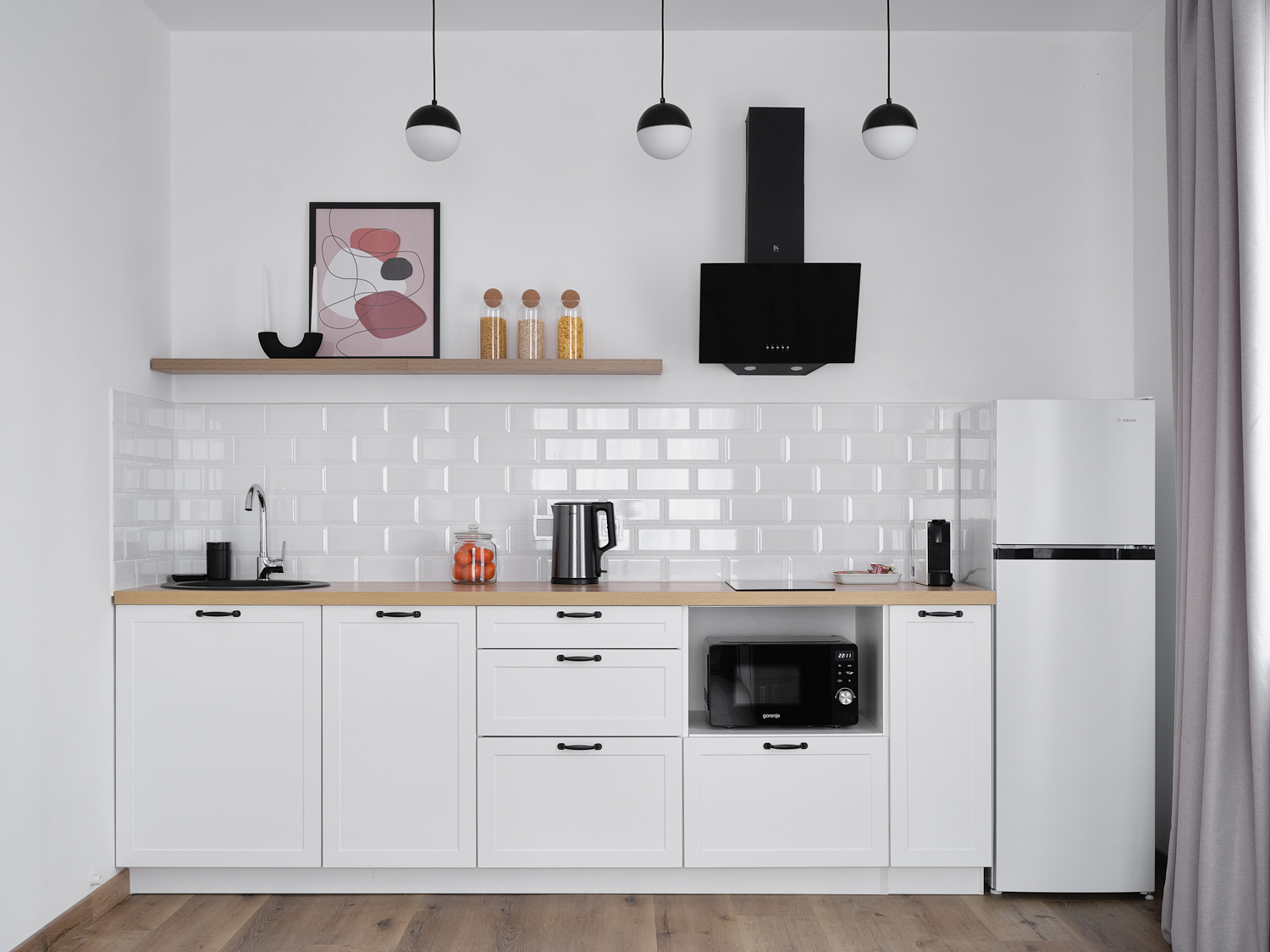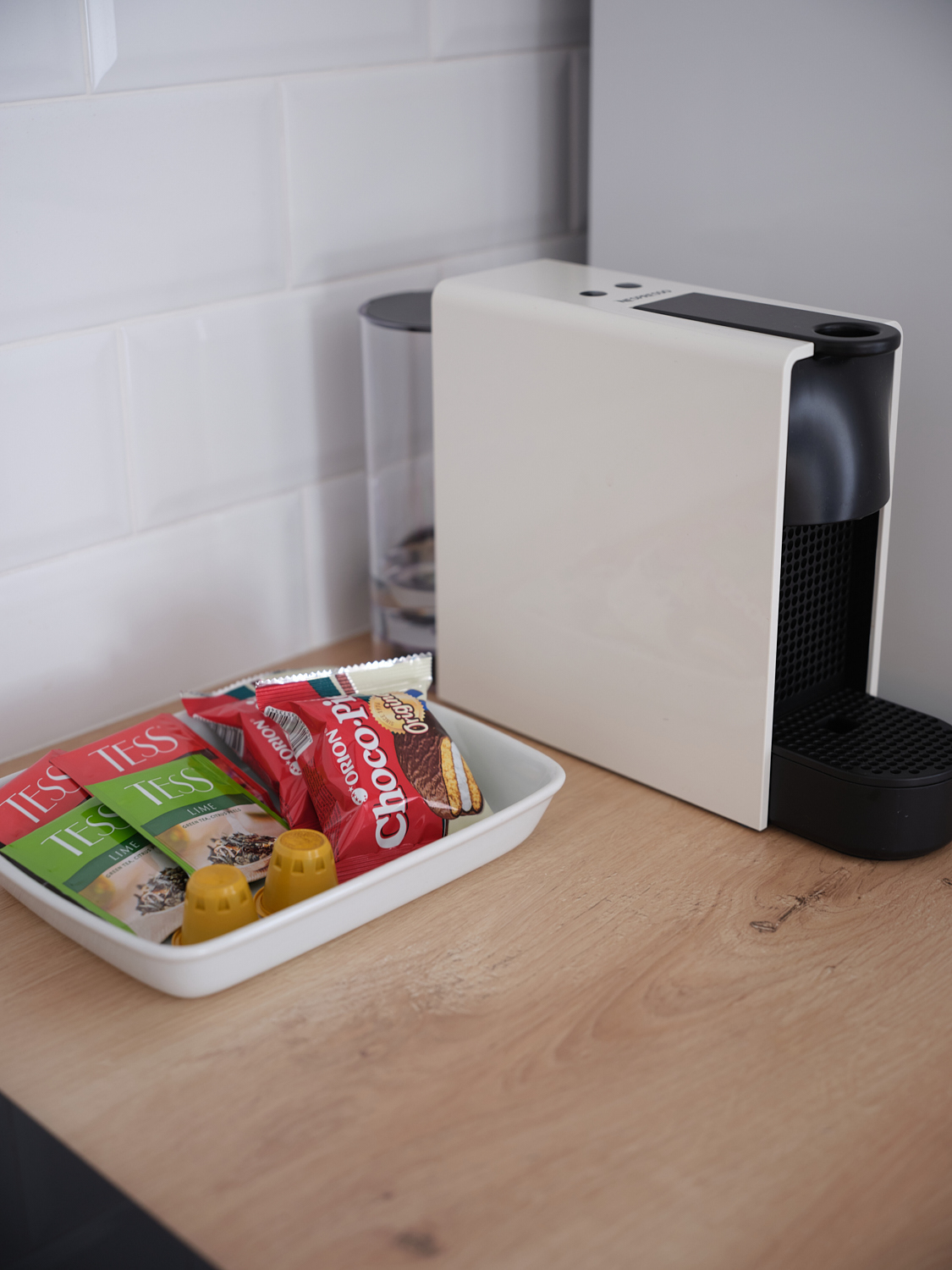 Кухня с плитой, холодильником, чайником, кофемашиной;