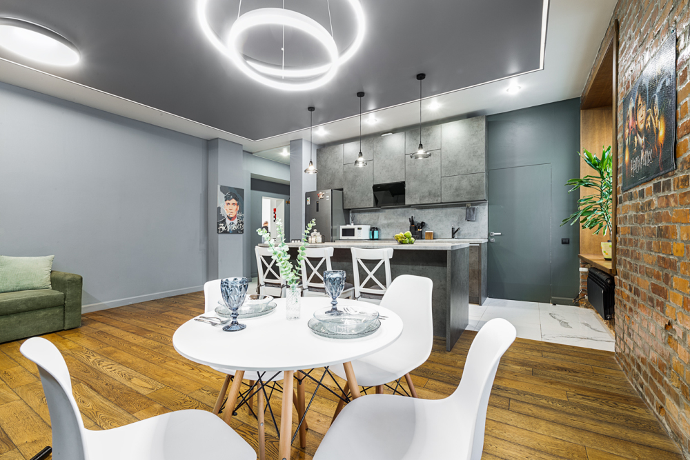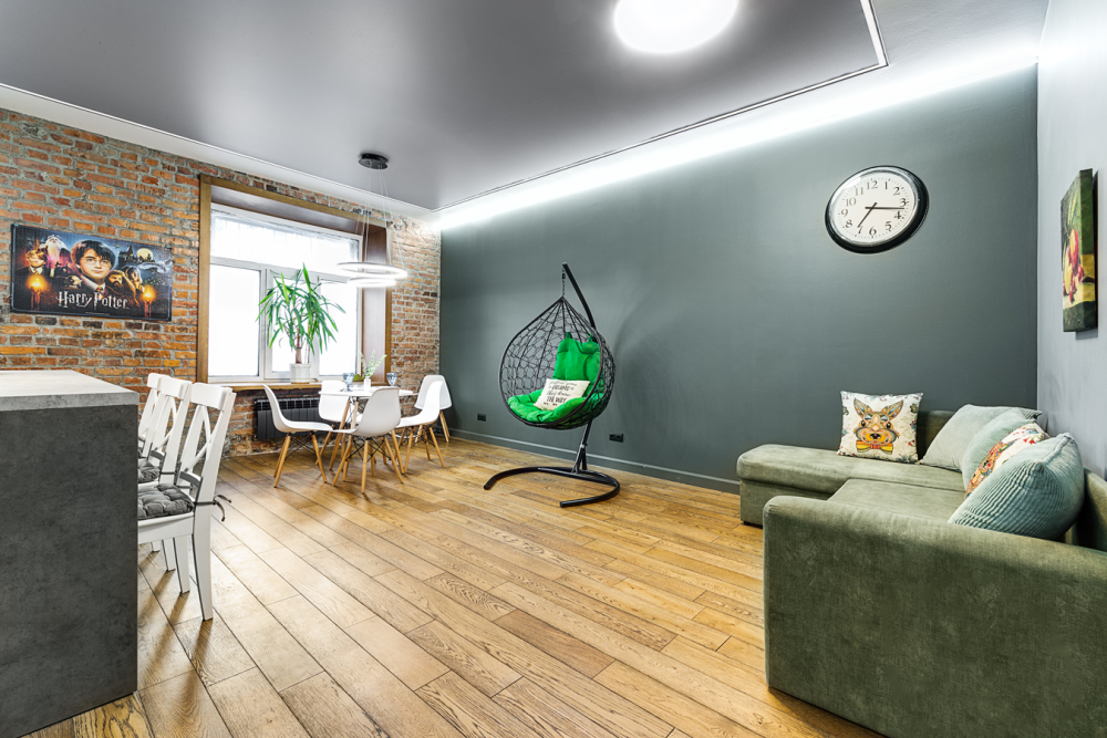 Просторная гостиная со столовой зоной и большим диваном.