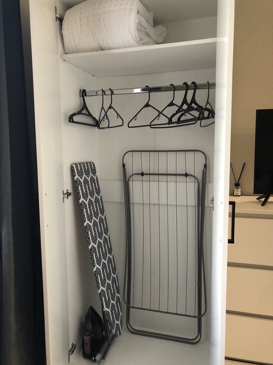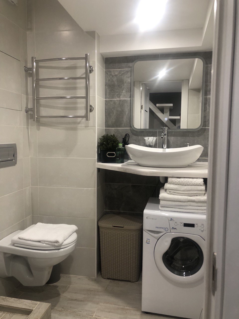 - полностью оборудованная мини-кухня, бытовая техника (варочная поверхность, микроволновая печь, холодильник, стиральная машинка),