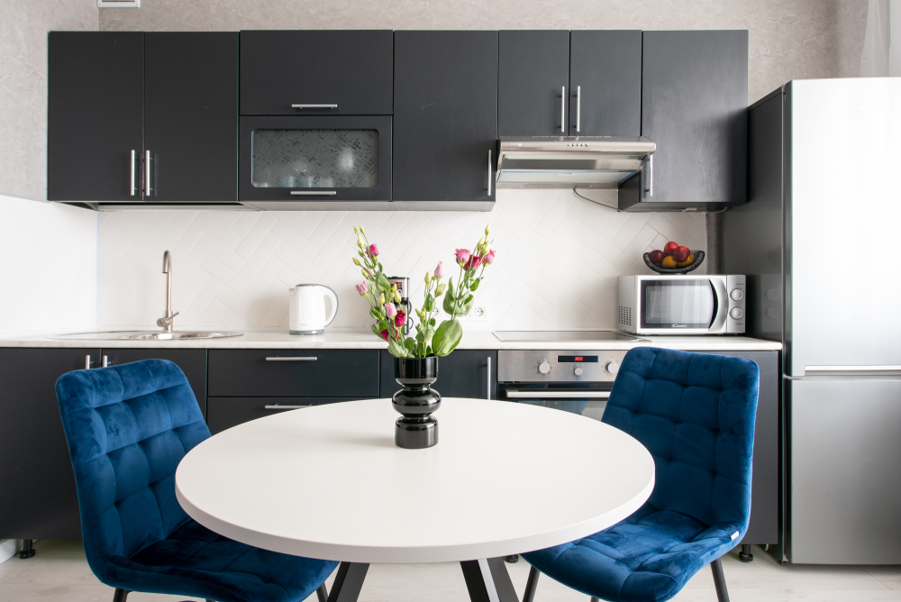 - Полностью оборудованную кухню: плита, холодильник, микроволновая печь, посуда и всё необходимое для готовки.