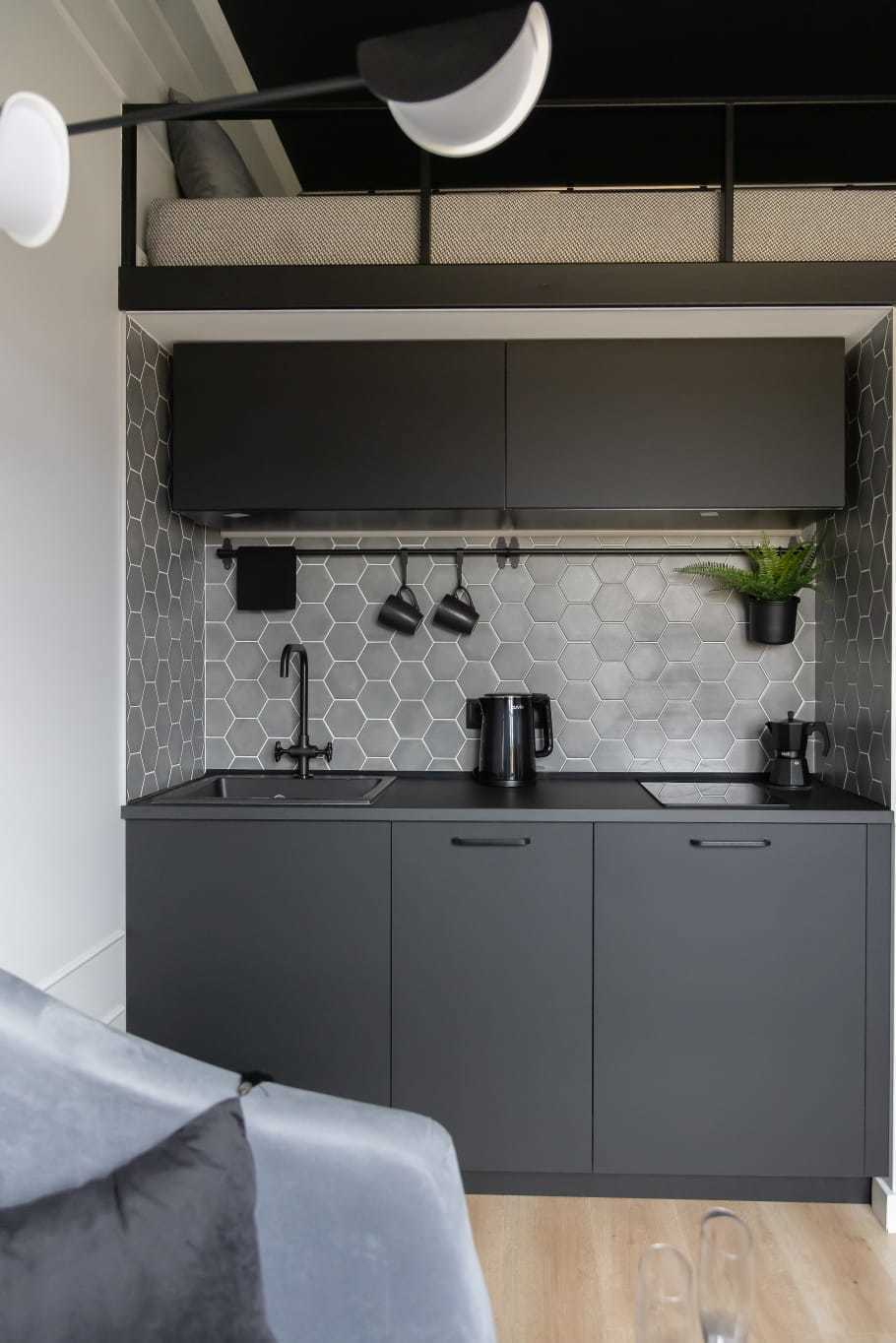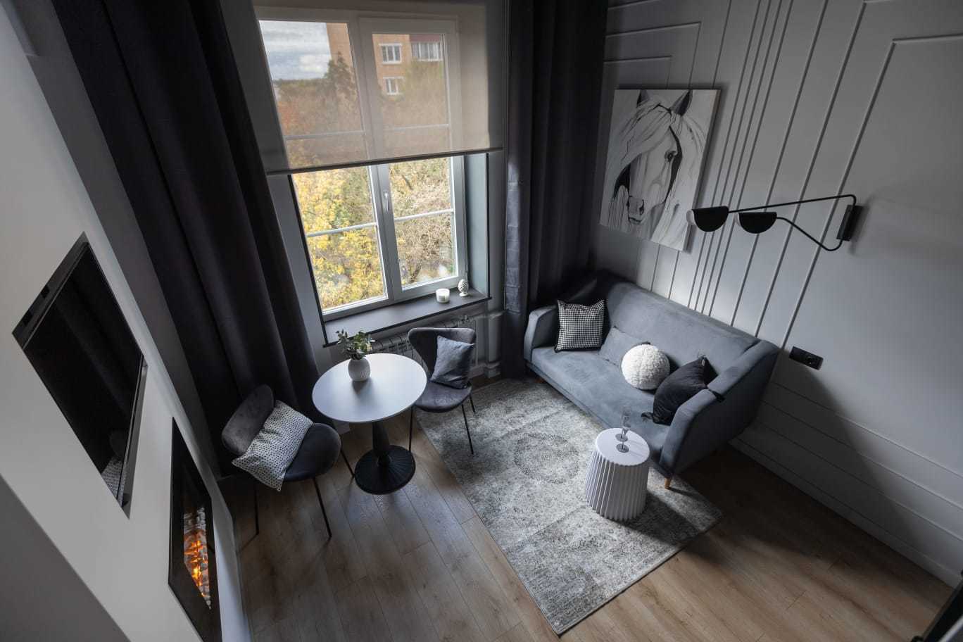 Квартира оборудована электрокамином, который добавит особую романтику и теплую атмосферу в ваше пребывание. В студии есть все необходимое для вашего комфорта: полностью оборудованная мини-кухня, бытовая техника (варочная поверхность, микроволновая печь, холодильник, стиральная машинка), полный комплект посуды для приготовления и приёма еды, гладильная доска, сушилка, утюг, постельное и полотенца, шампунь/гель/мыло, фен, двуспальная кровать king-size, диван-кровать 140 см. Вы также можете воспользоваться бесплатным Wi-Fi и телевидением.