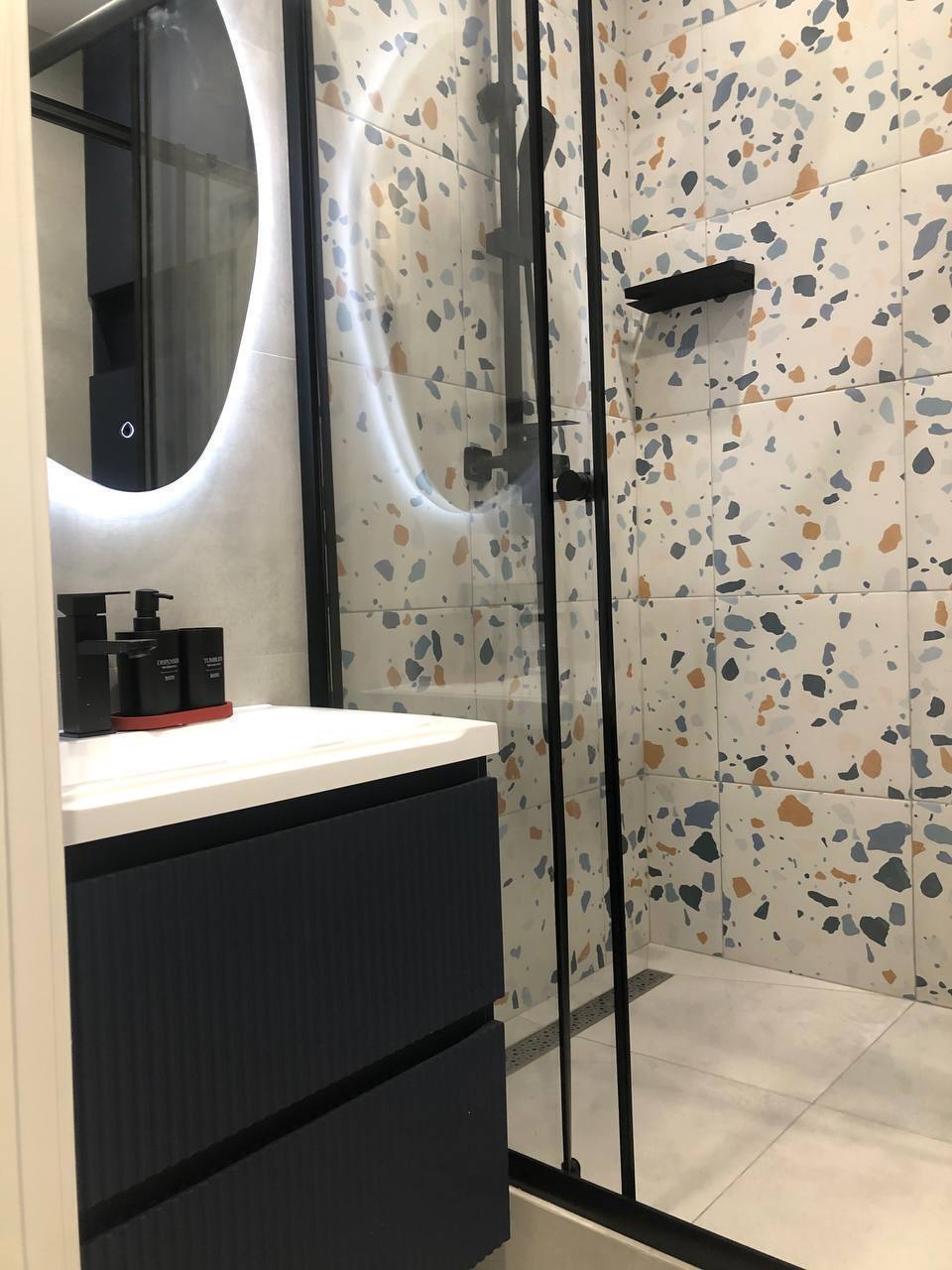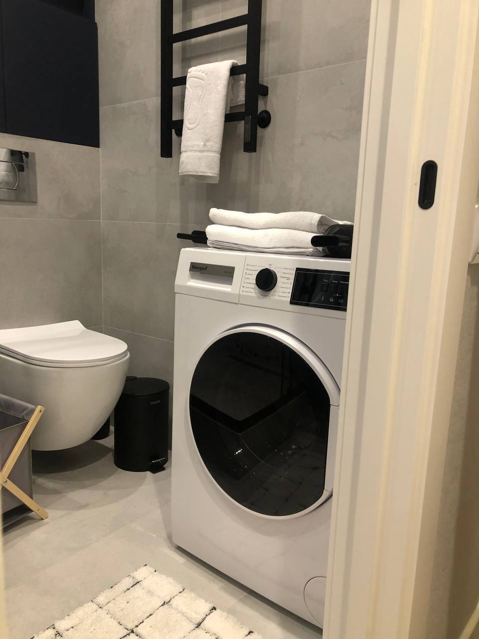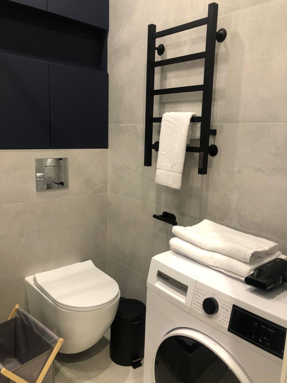 Ванная комната: ванна, полотенца, стиральная машина, утюг; гладильная доска, сушилка, гель для душа, шампунь, мыло.