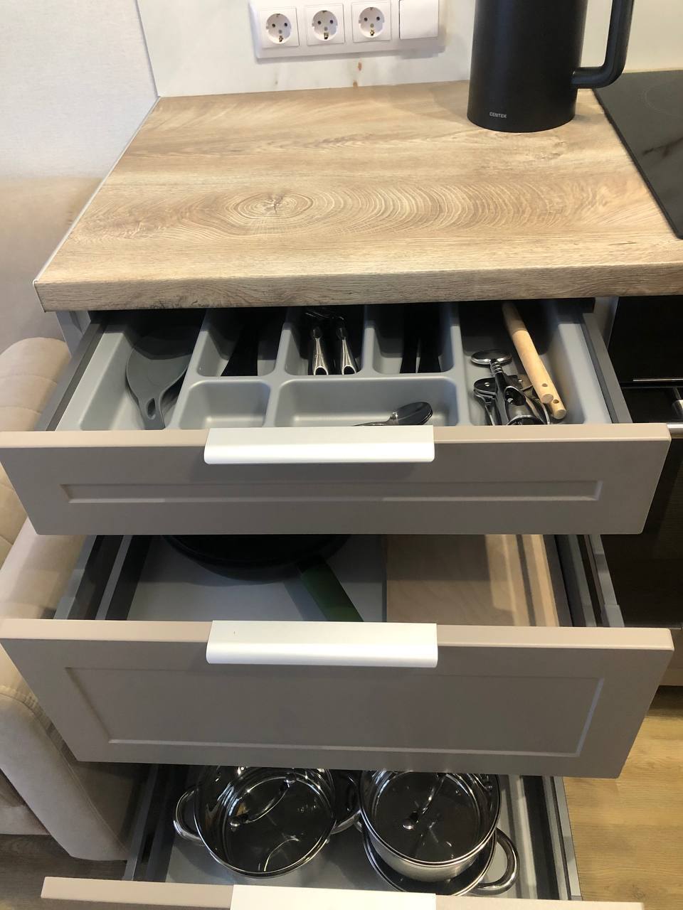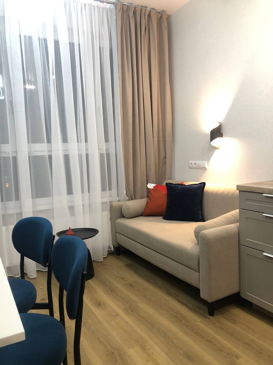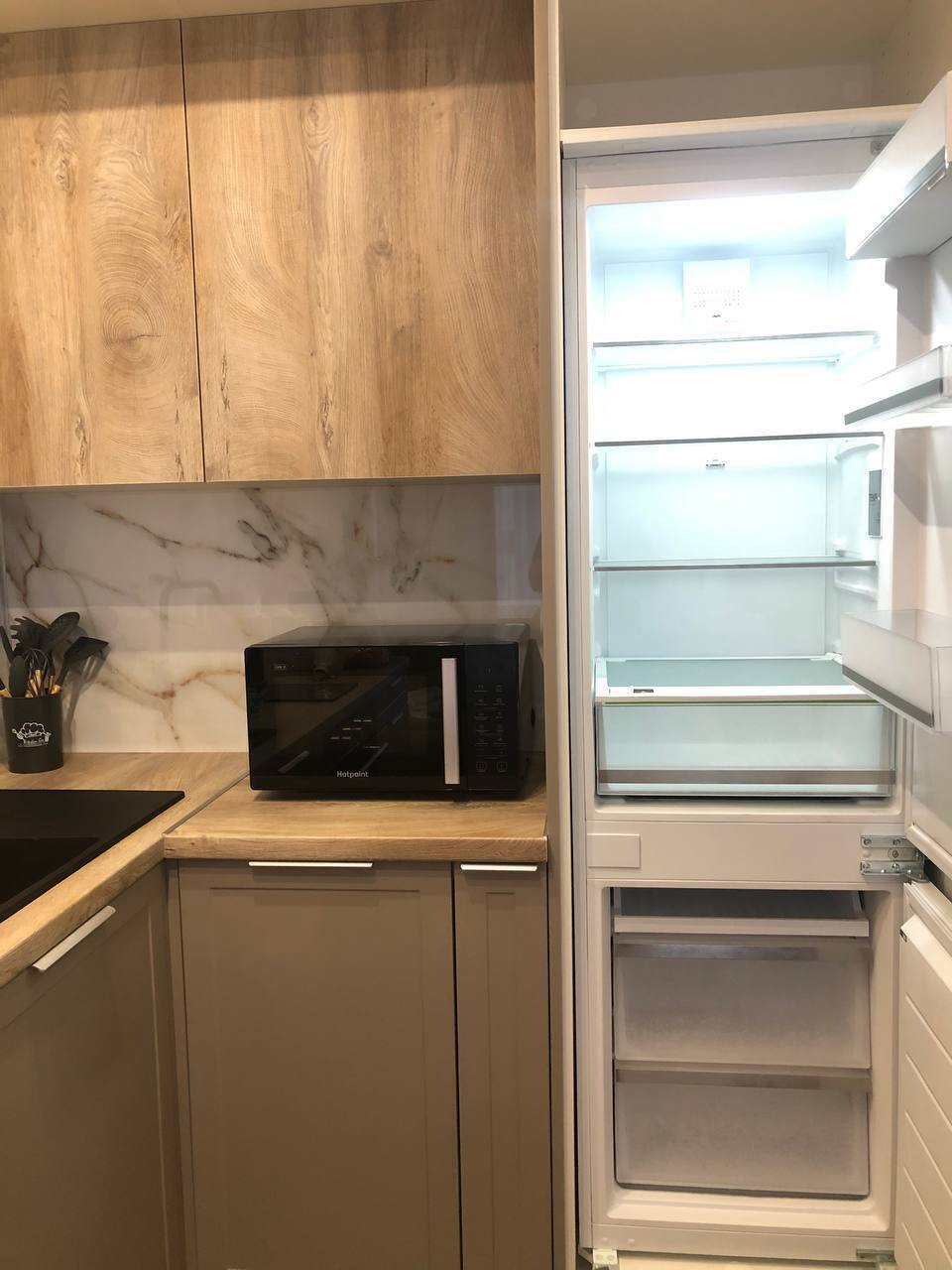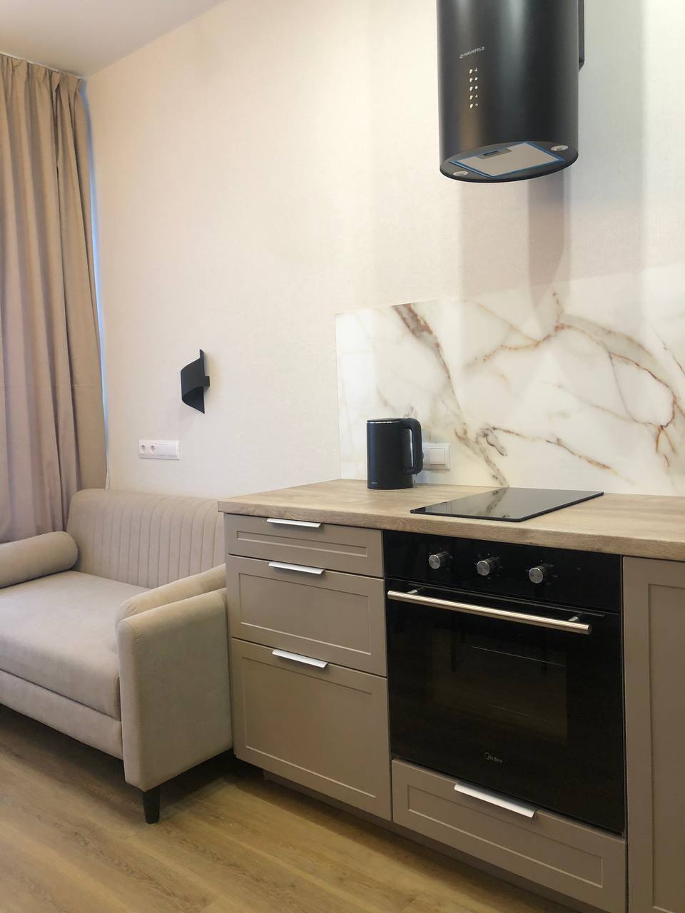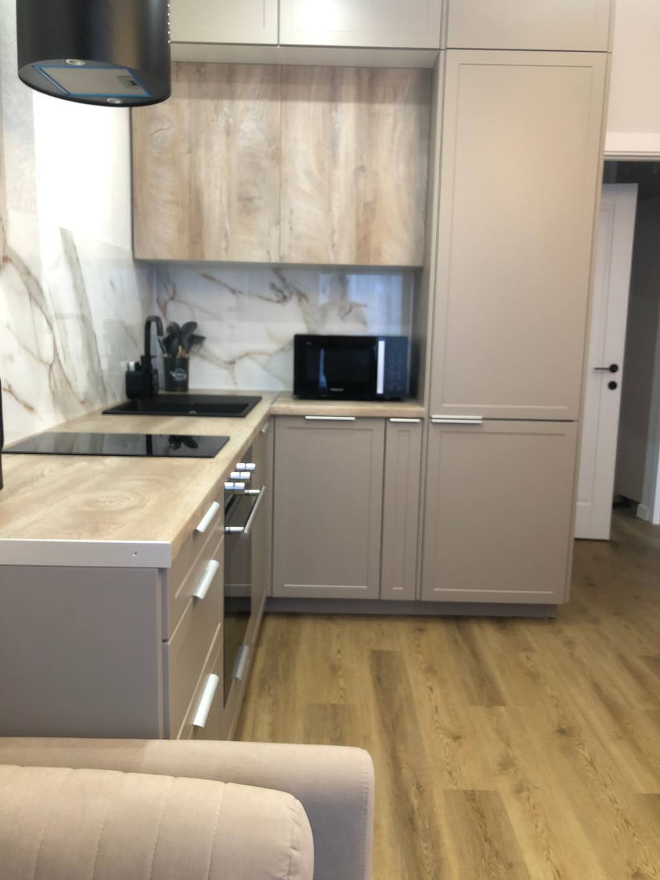 Кухня: 2-спальный раздвижной диван 140×200, посудомоечная машина, плита, холодильник, вытяжка, духовой шкаф, вся необходимая утварь, микроволновая печь, чайник, чай, сахар, соль.