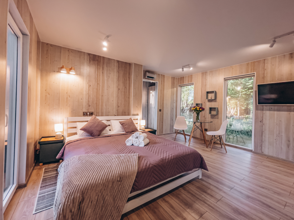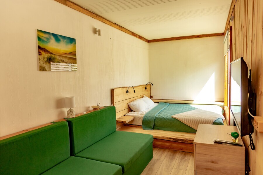Номер 32 м² повышенного комфорта с террасой и просторной спальней. Из окон открывается вид на живописный лес. Планировка: просторная спальня, прихожая и ванная комната.