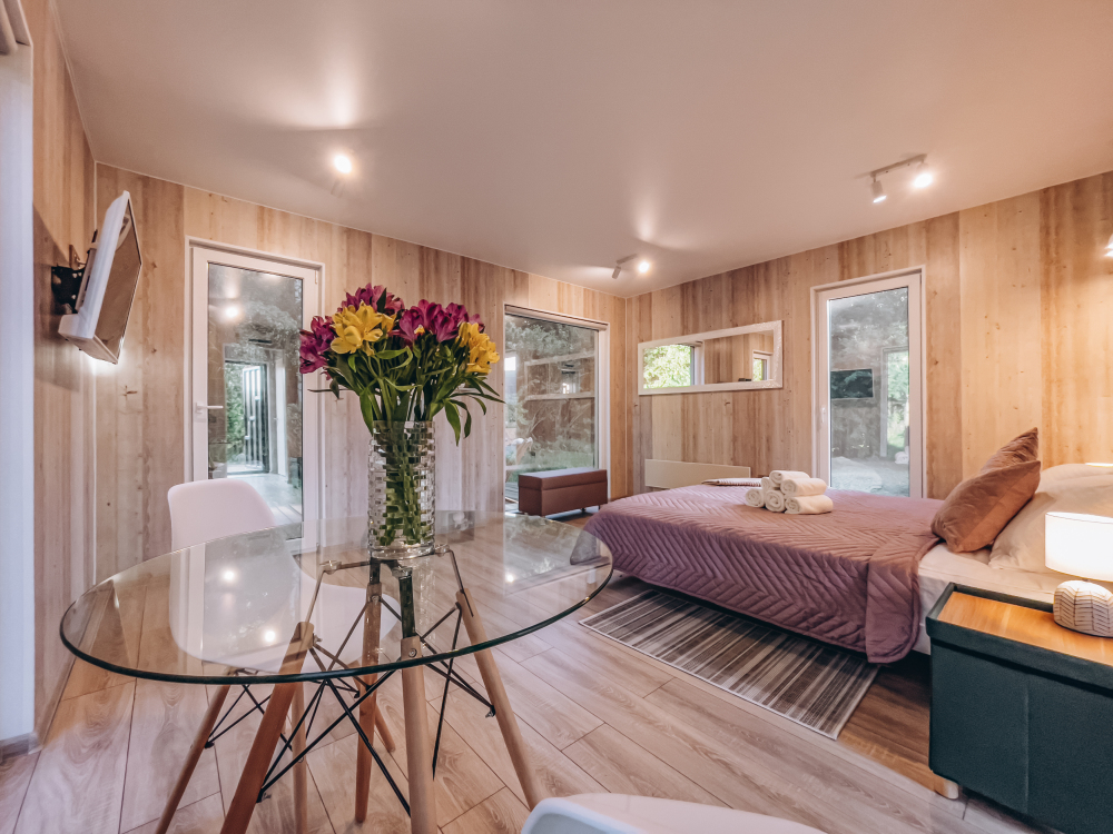 Уютный номер общей площадью 28 м² со спальней, ванной комнатой и террасой, с которой открывается вид на лес или сад.
