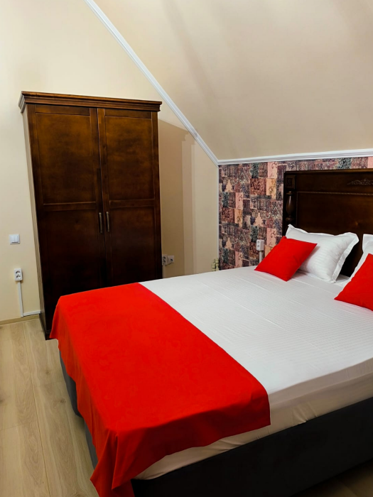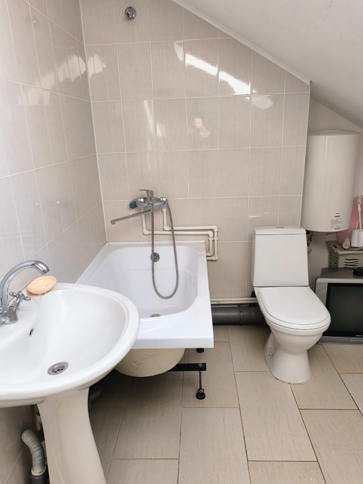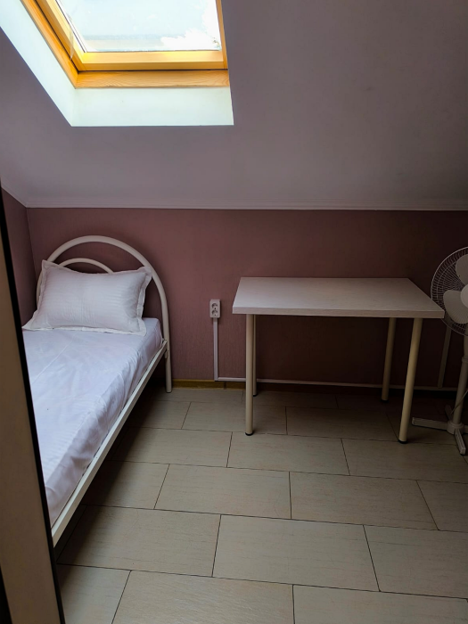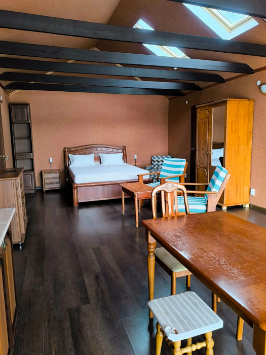 Комфортабельный номер на мансардном этаже со всеми удобствами: кровати, кухня, стол и стулья, телевизор, холодильник, чайник, набор посуды и доступ к Wi-Fi. Балкон также входит в ваше распоряжение.