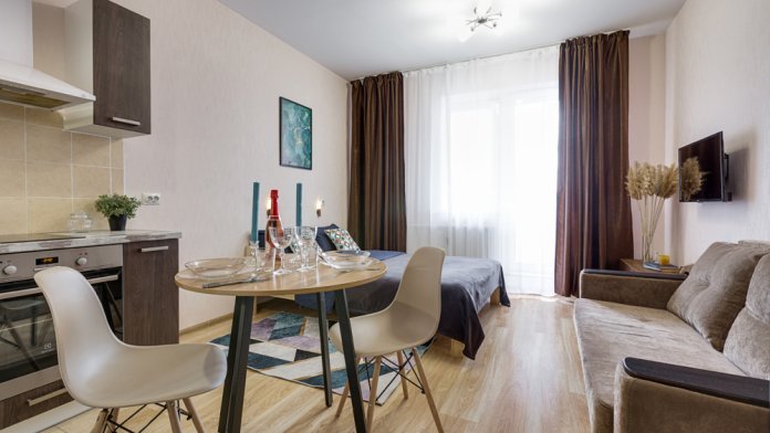 Для удобства есть всё, все мелочи продуманы. Комфортная двуспальная кровать и ортопедическим матрасом и двуспальный диван-кровать. Кухонная зона, позволяющая творить свои кулинарные шедевры. Вся техника тоже имеется: микроволновая печь, плита стеклокерамическая, чайник, холодильник. Вся посуда для приема еды и приготовления. Стол и стулья.