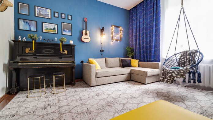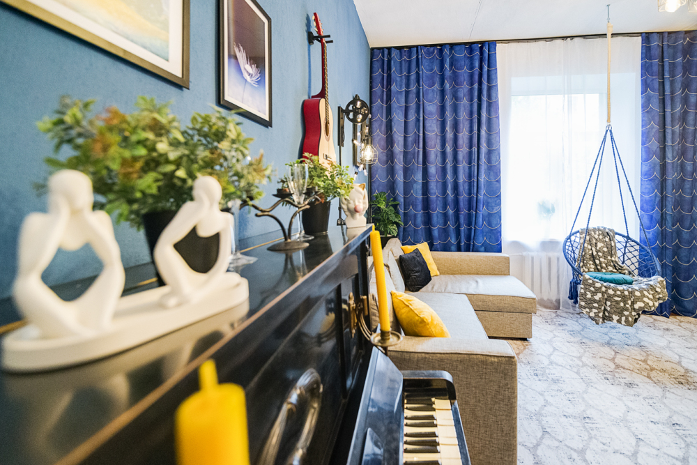 В квартире есть всё для комфортного проживания. Также есть домашний кинотеатр, кресло-качели, огромная библиотека и даже пианино.