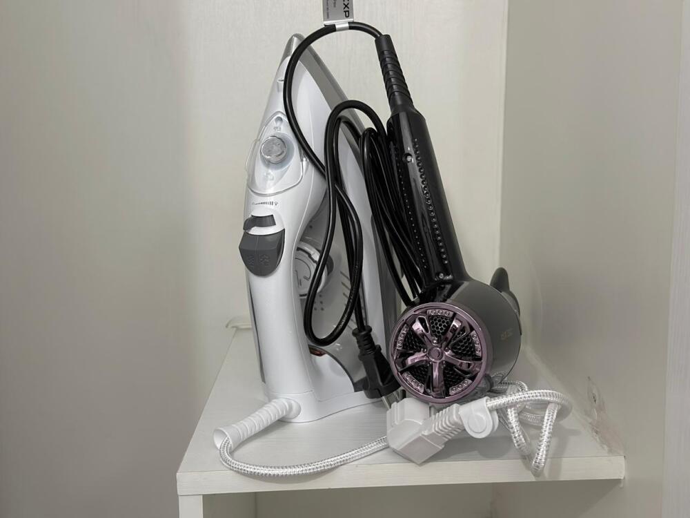 Бытовая техника: холодильник, плита, фен, СВЧ, стиральная машина, сушилка для белья, утюг, чайник.