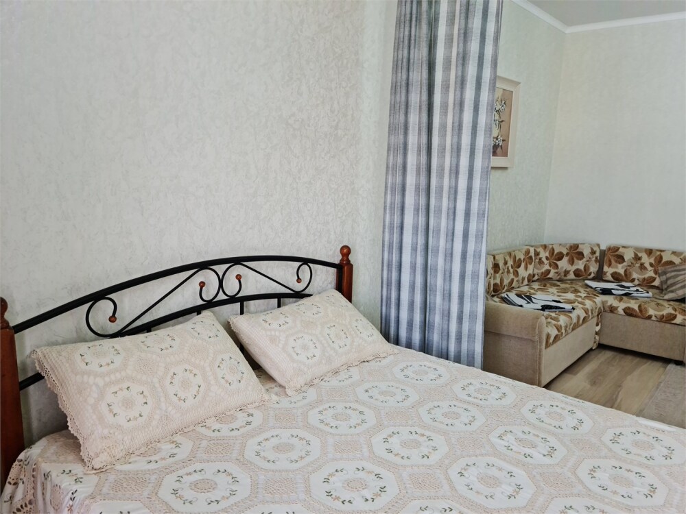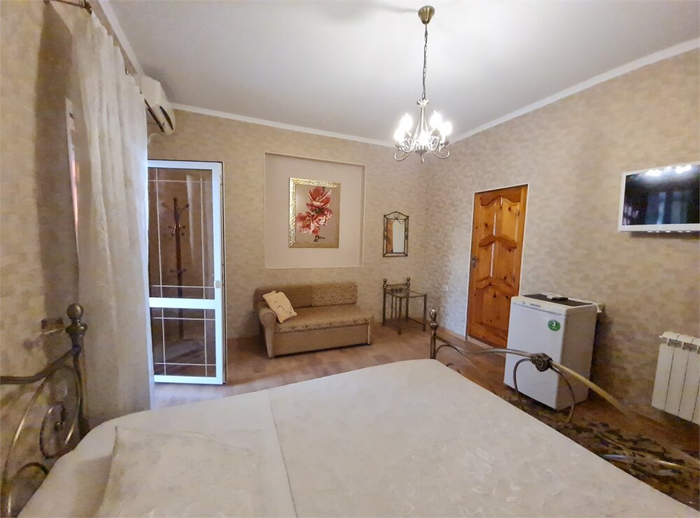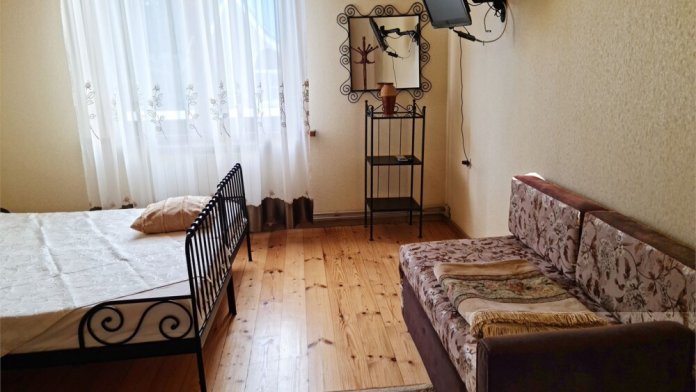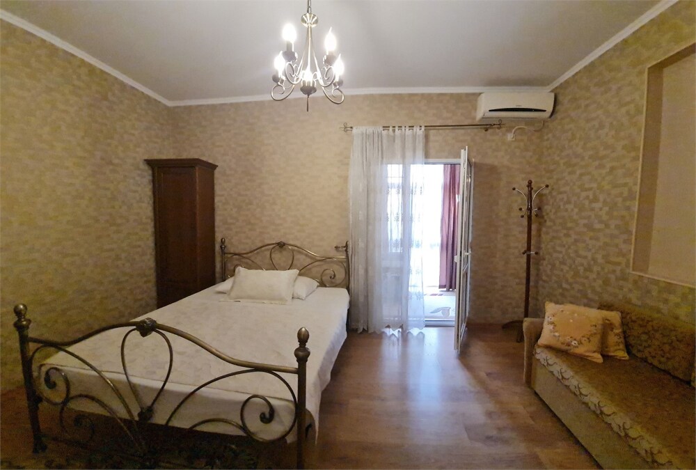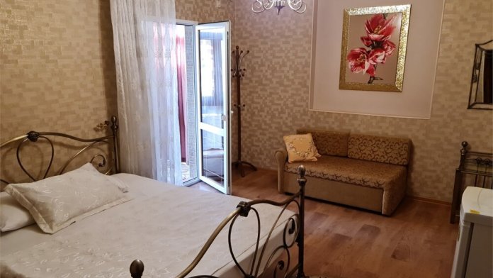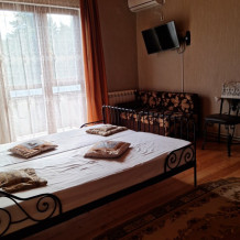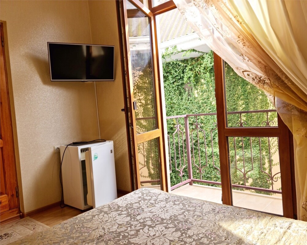 Номер «Стандарт четырехместный» с выходом на террасу второго этажа, выполнен в современном стиле, оборудован кондиционером, ТВ, холодильником, в номере одна двуспальная кровать и два раскладных дивана, что позволяет гостям чувствовать себя комфортно и наслаждаться отдыхом в нашем гостевом доме. Терраса номера выходит во внутренний двор второго корпуса и позволяет сохранять тишину в номере и оградить Вас от шумной городской жизни. Один ребёнок до 6 лет — можно без отдельного спального места.