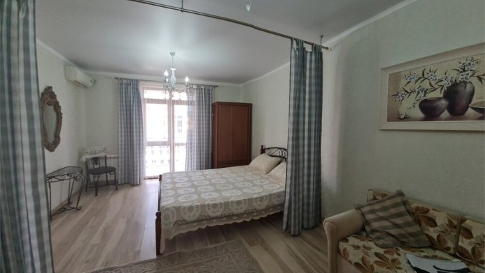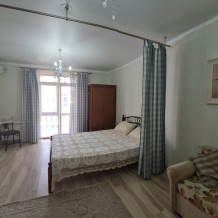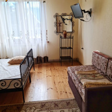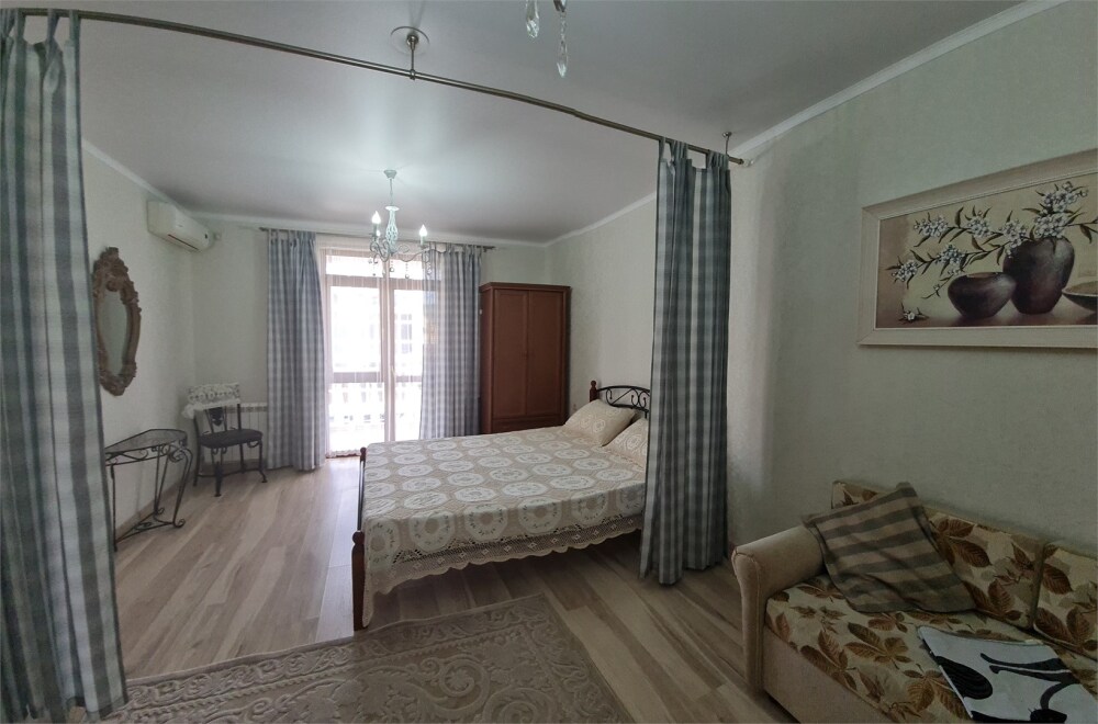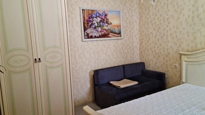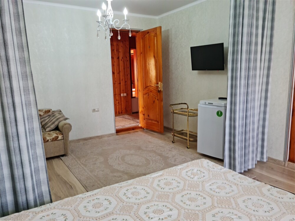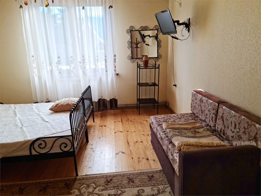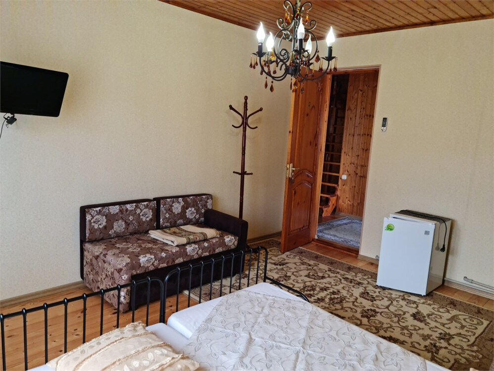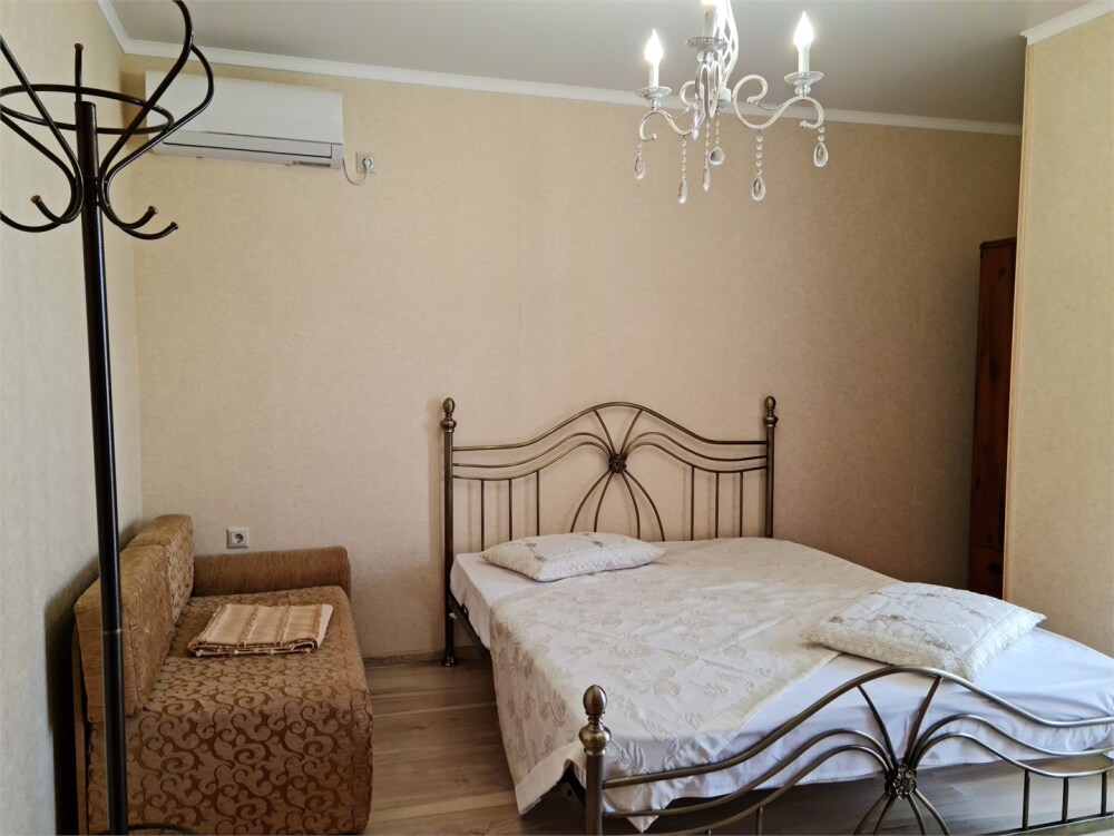 Номер «Стандарт четырехместный» с выходом на террасу второго этажа, выполнен в современном стиле, оборудован кондиционером, ТВ, холодильником, в номере одна двуспальная кровать и два раскладных дивана, что позволяет гостям чувствовать себя комфортно и наслаждаться отдыхом в нашем гостевом доме. Терраса номера выходит во внутренний двор второго корпуса и позволяет сохранять тишину в номере и оградить Вас от шумной городской жизни. Один ребёнок до 6 лет — можно без отдельного спального места.