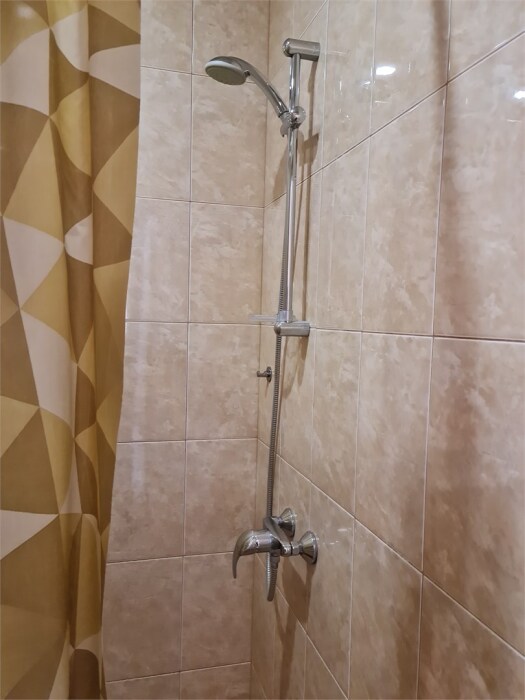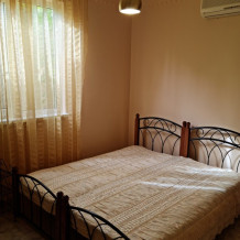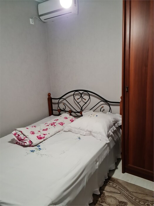 номер небольшой по площади, выполнен в современном стиле, оборудован кондиционером, ТВ, холодильником. Общие туалетная комната и душ предназначены для 2-х номеров.