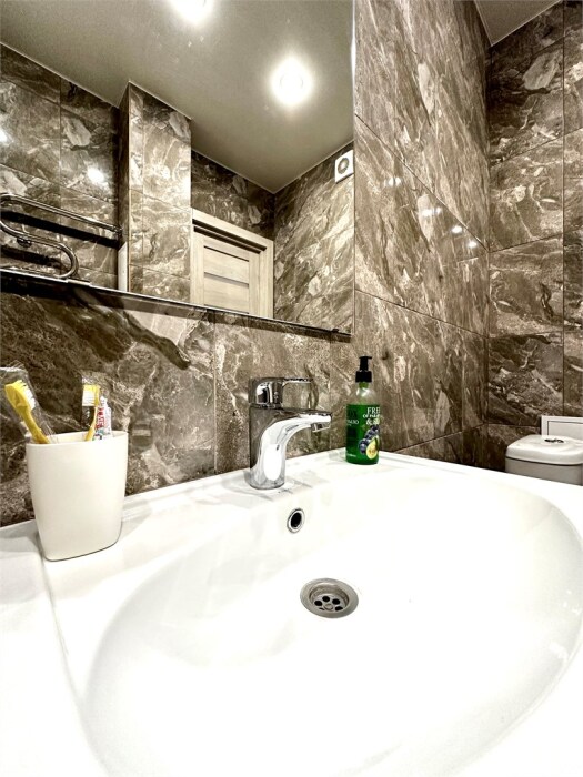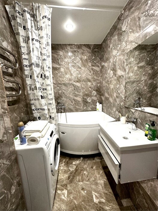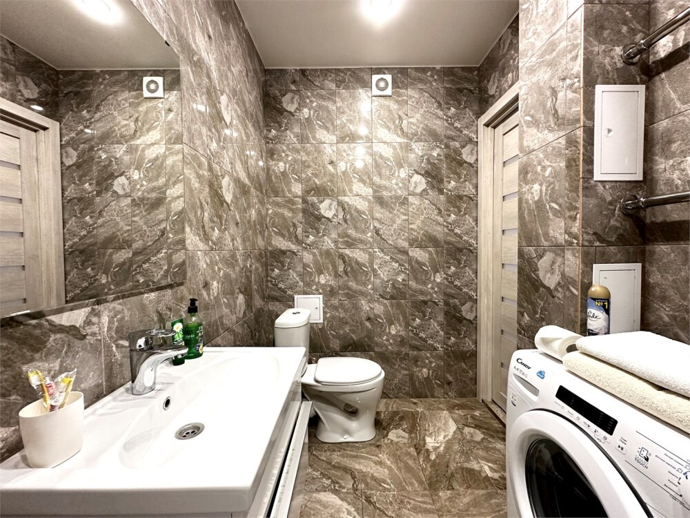 - Просторная ванная комната, а также фен, махровые полотенца, стиральная машина, сушилка, жидкое мыло, гель для душа, шампунь