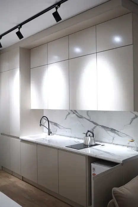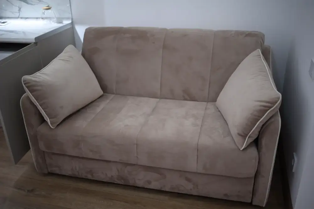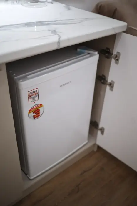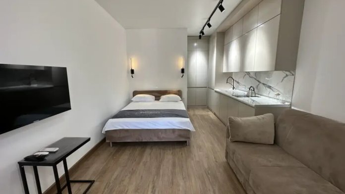В номере двухспальная кровать, шкаф, холодильник, кондиционер, чайник, телевизор, кухня.