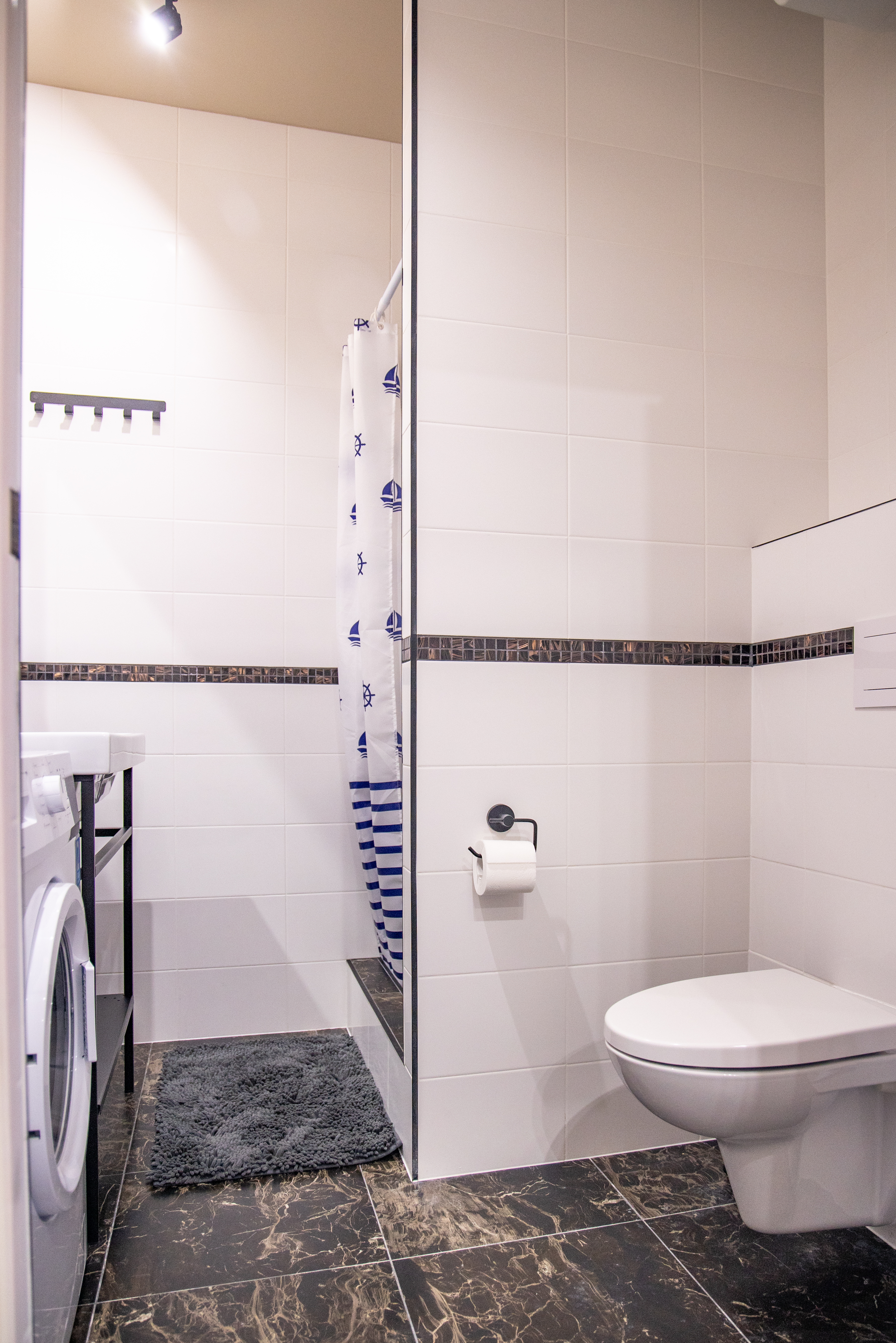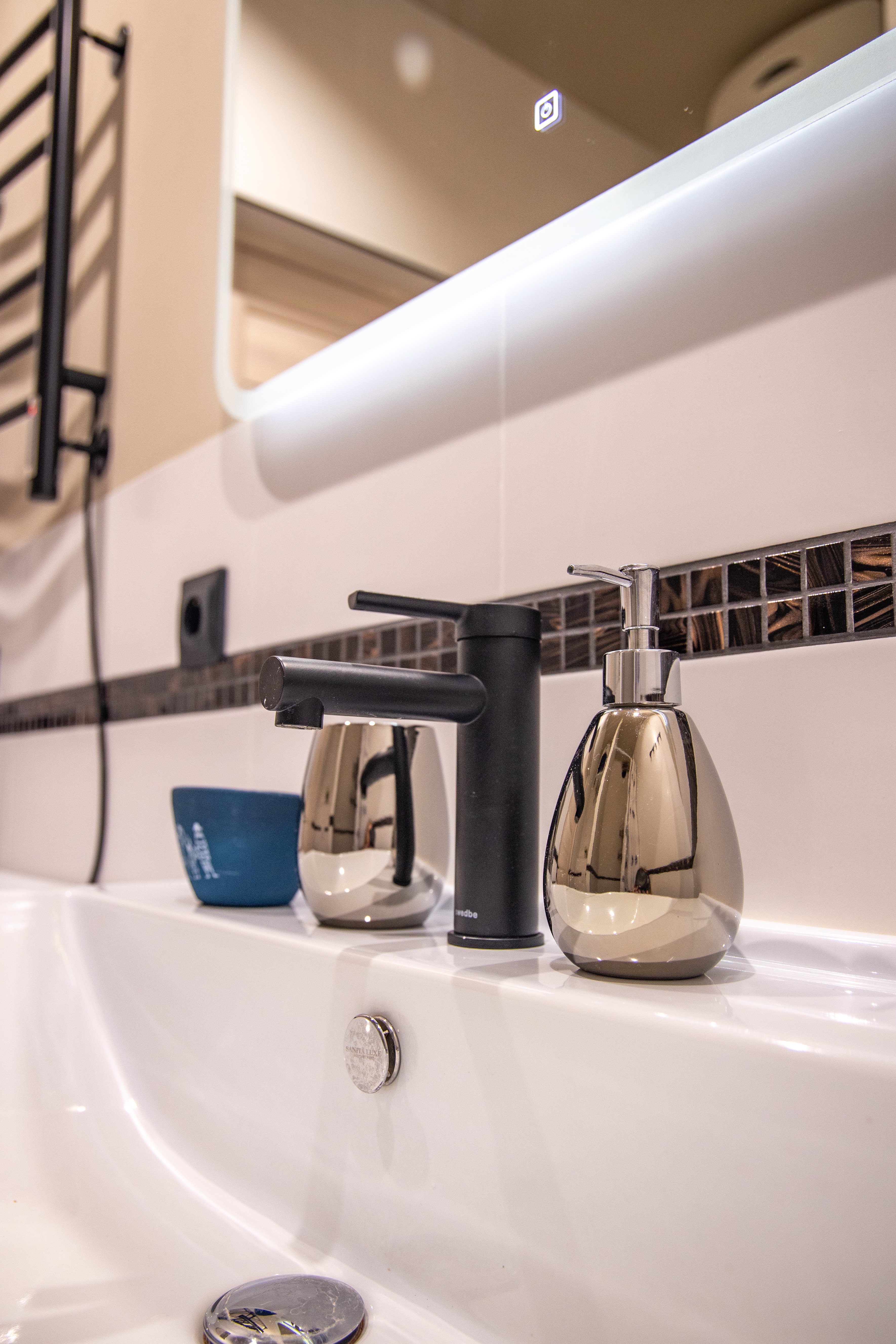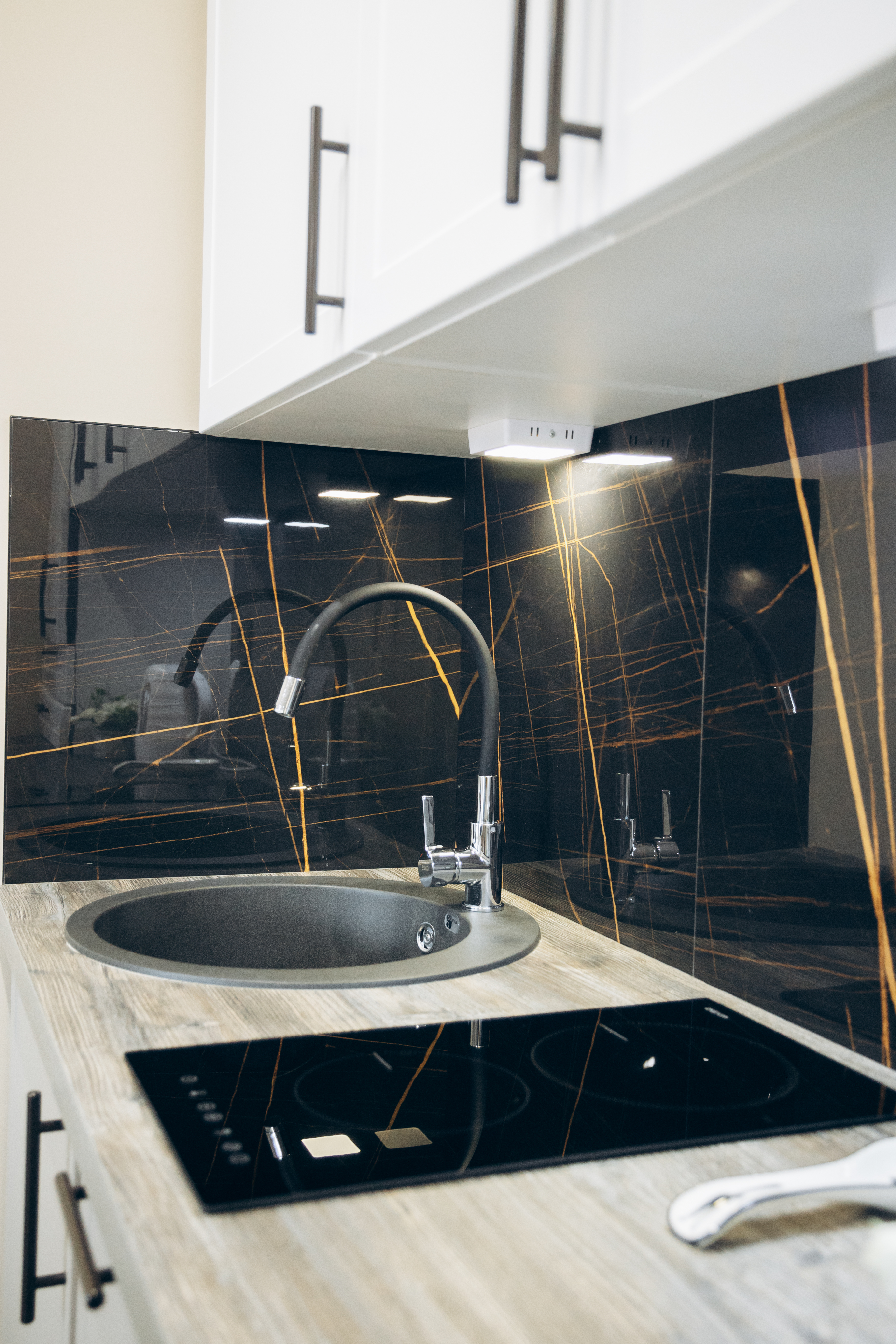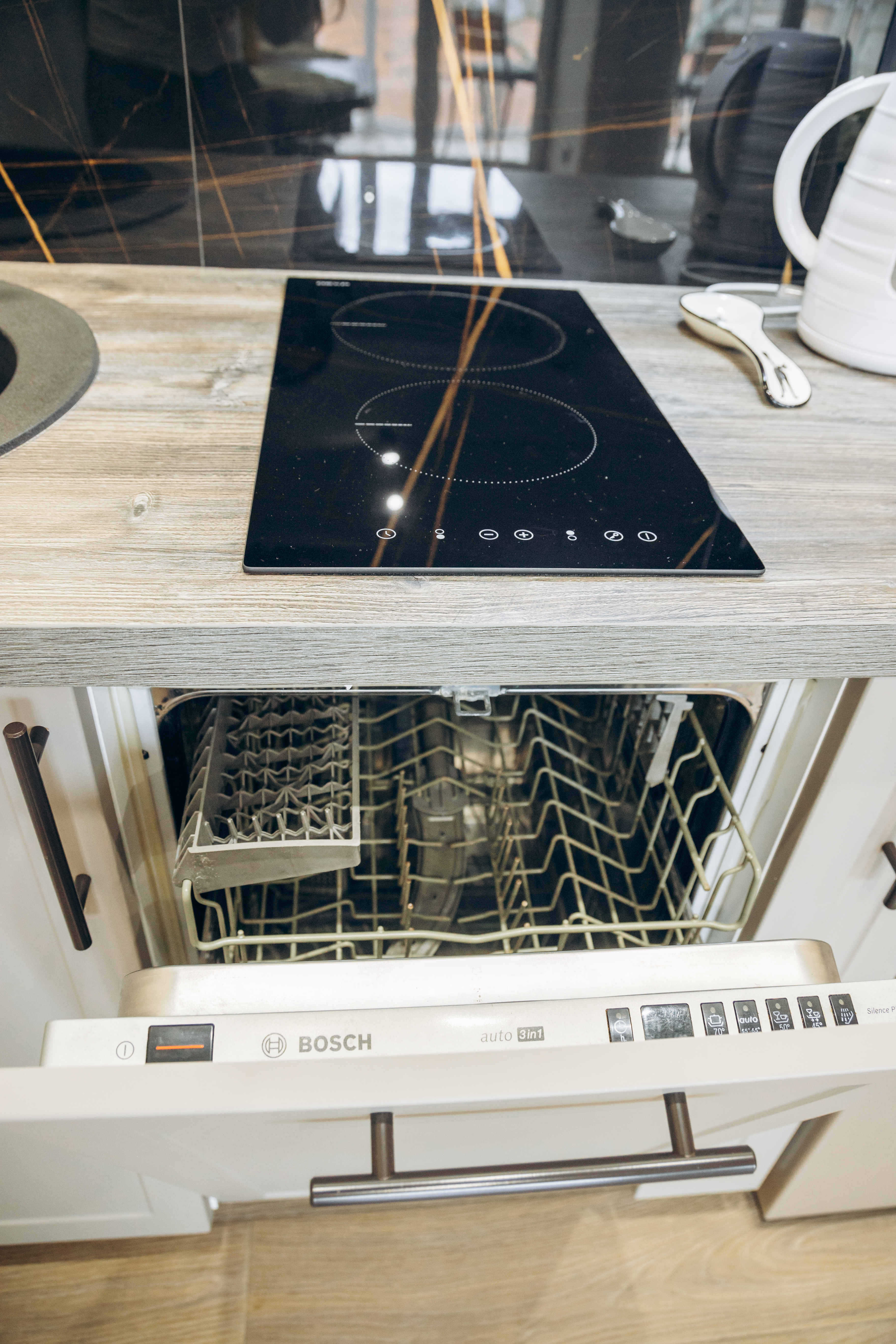 - Кухня со всем необходимым (холодильник, индукционная варочная панель, вытяжка, посудомоечная машина, микроволновая печь, чайник, а так же посуда и приборы)