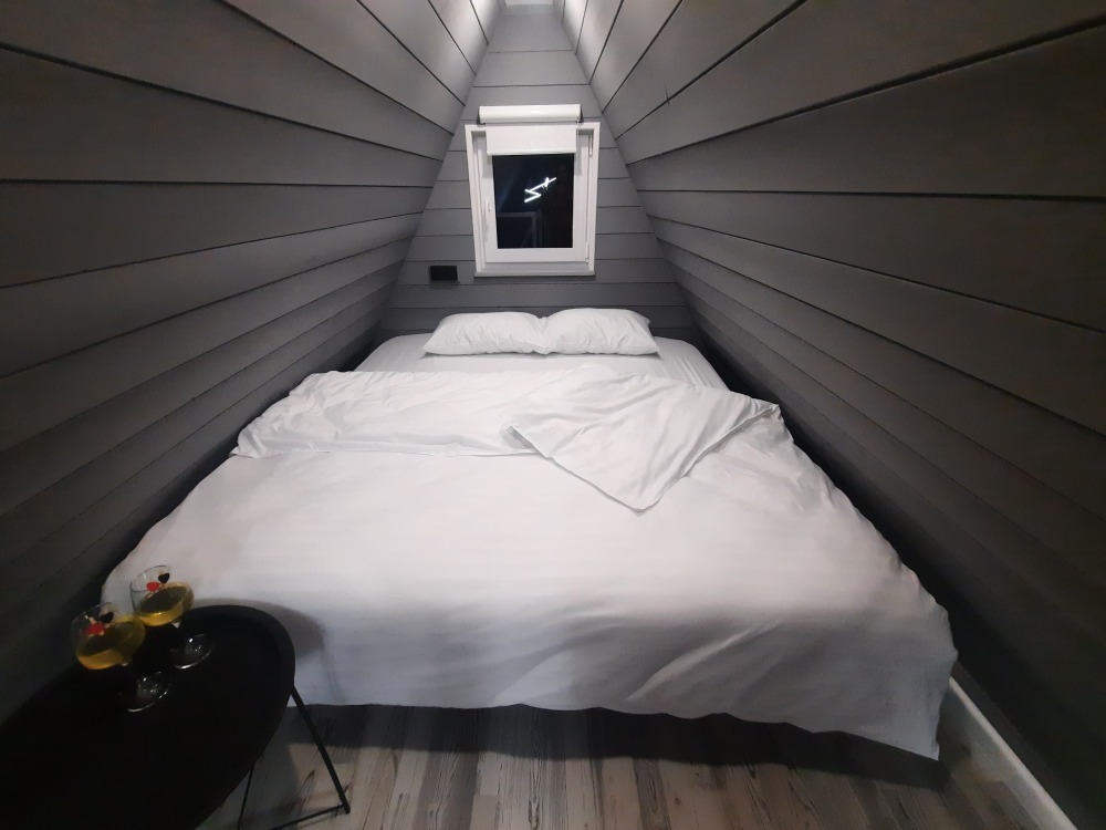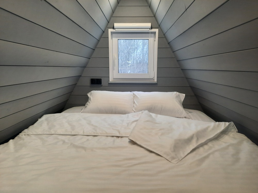- Кровать с ортопедическим матрасом размером 180×200 см с белоснежным постельным бельем на втором этаже.
