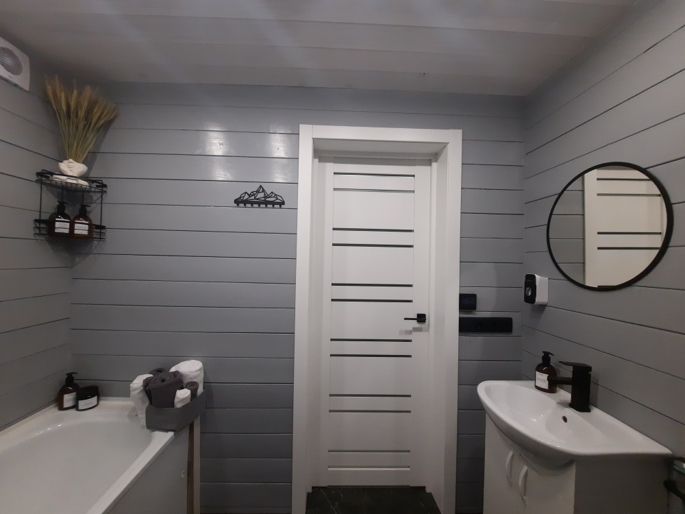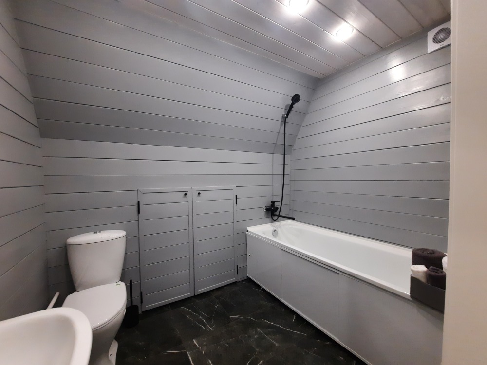 - Оснащена ванной со всем необходимым (набором полотенец, а также солью для ванны), в которой приятно расслабиться после трудовых дней, раковиной и туалетом, что создаёт приятные условия для отдыха.
