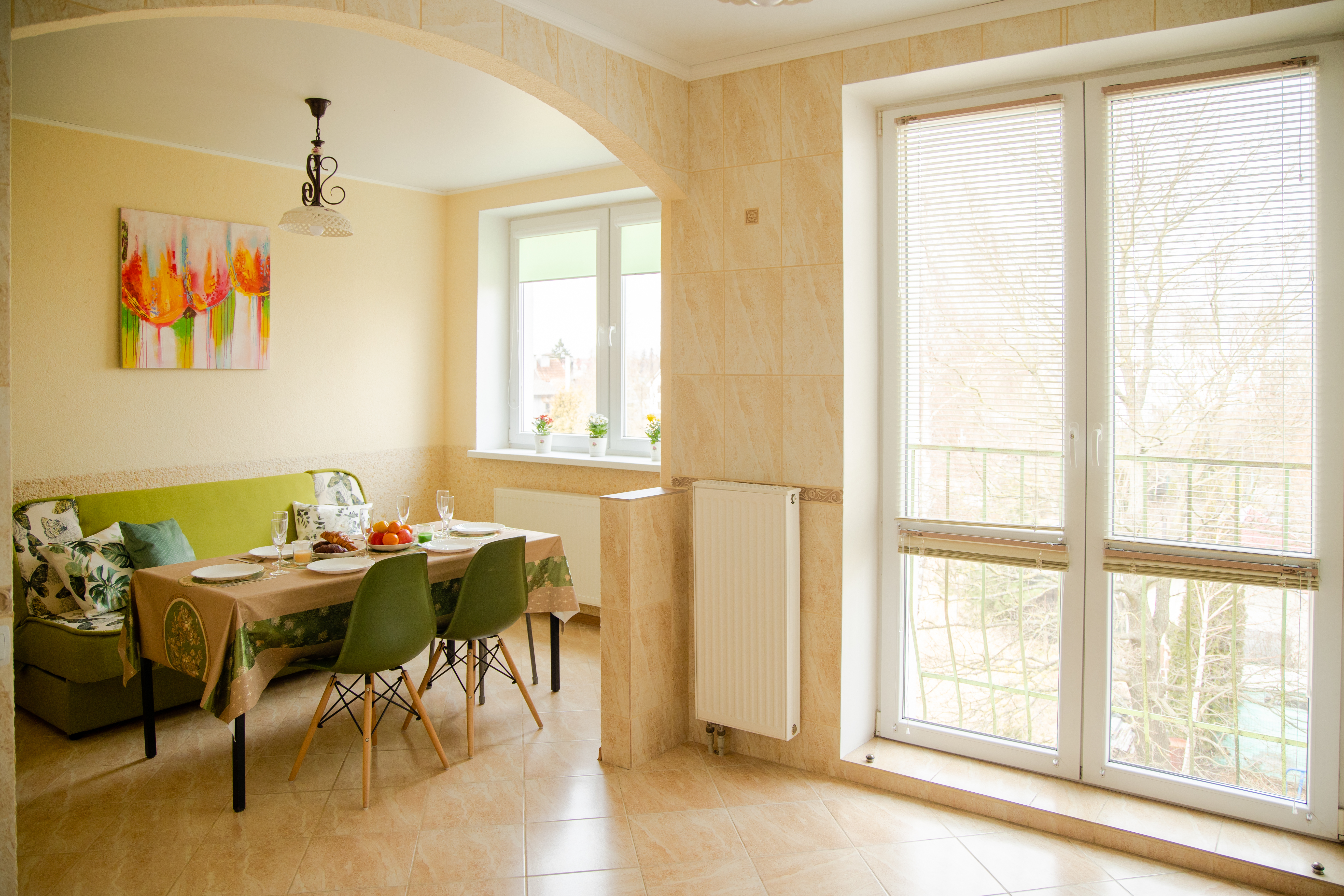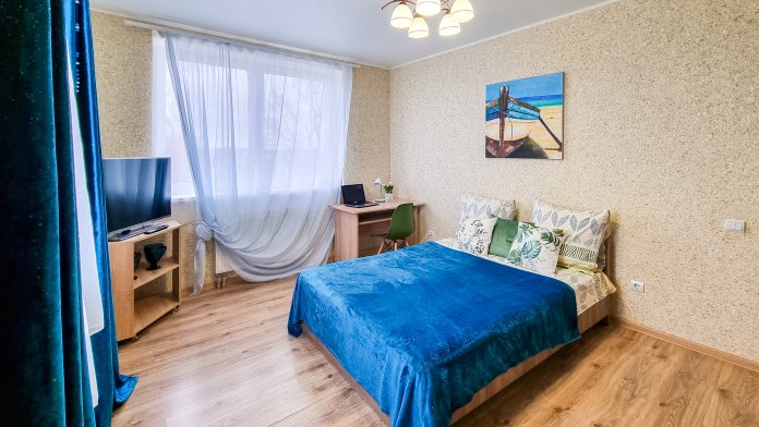 Большая уютная квартира с двумя спальнями и большой кухней-гостиной. В новом малоэтажном доме с бесплатной парковкой. Тихий спальный район, в шаговой доступности продуктовый магазин. До остановки общественного транспорта 5 минут пешком. До центра Калининграда на такси или общественным транспортом 20-30 минут. На общественном транспорте можно добраться до основных достопримечательностей Калининграда.