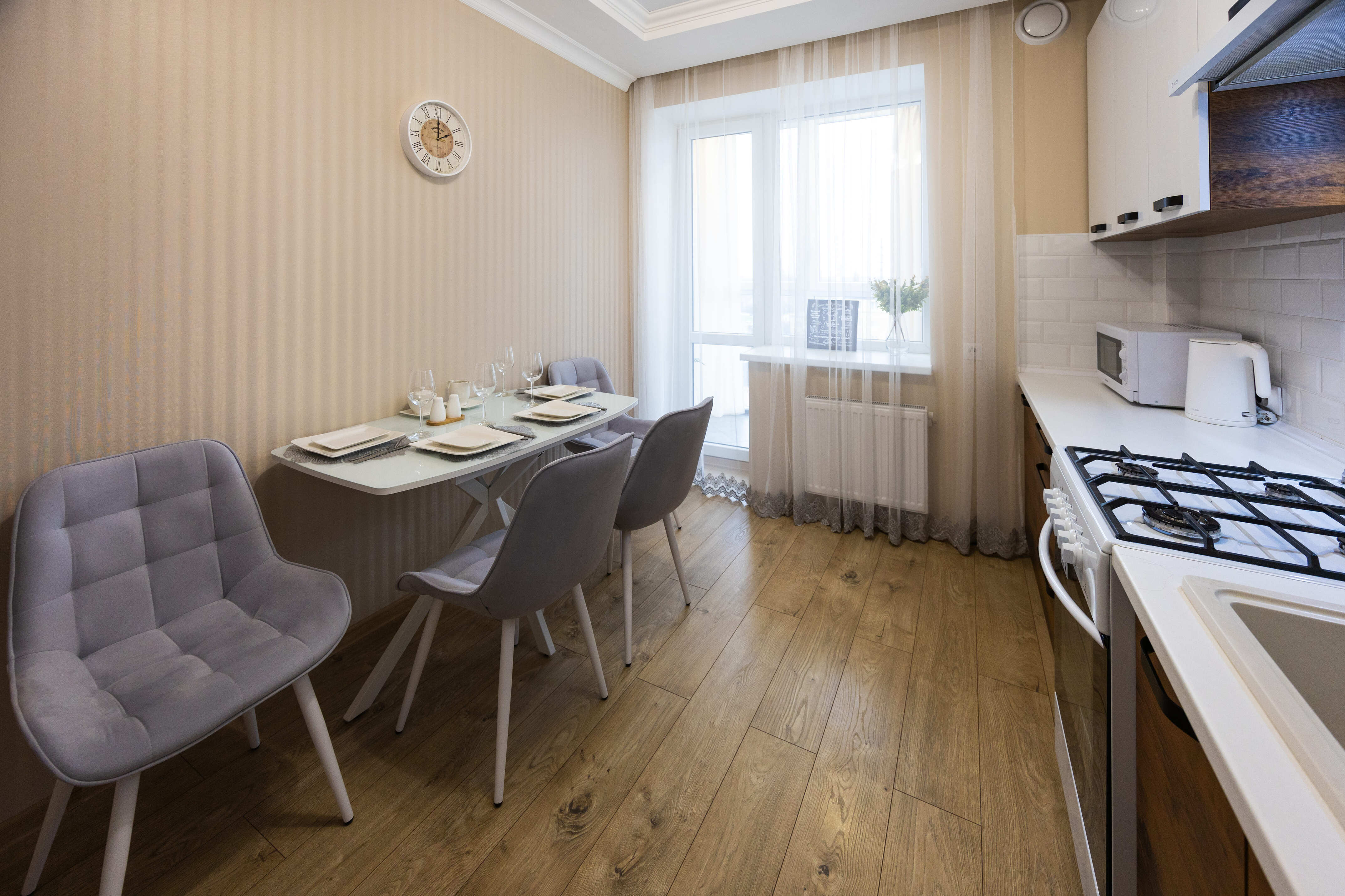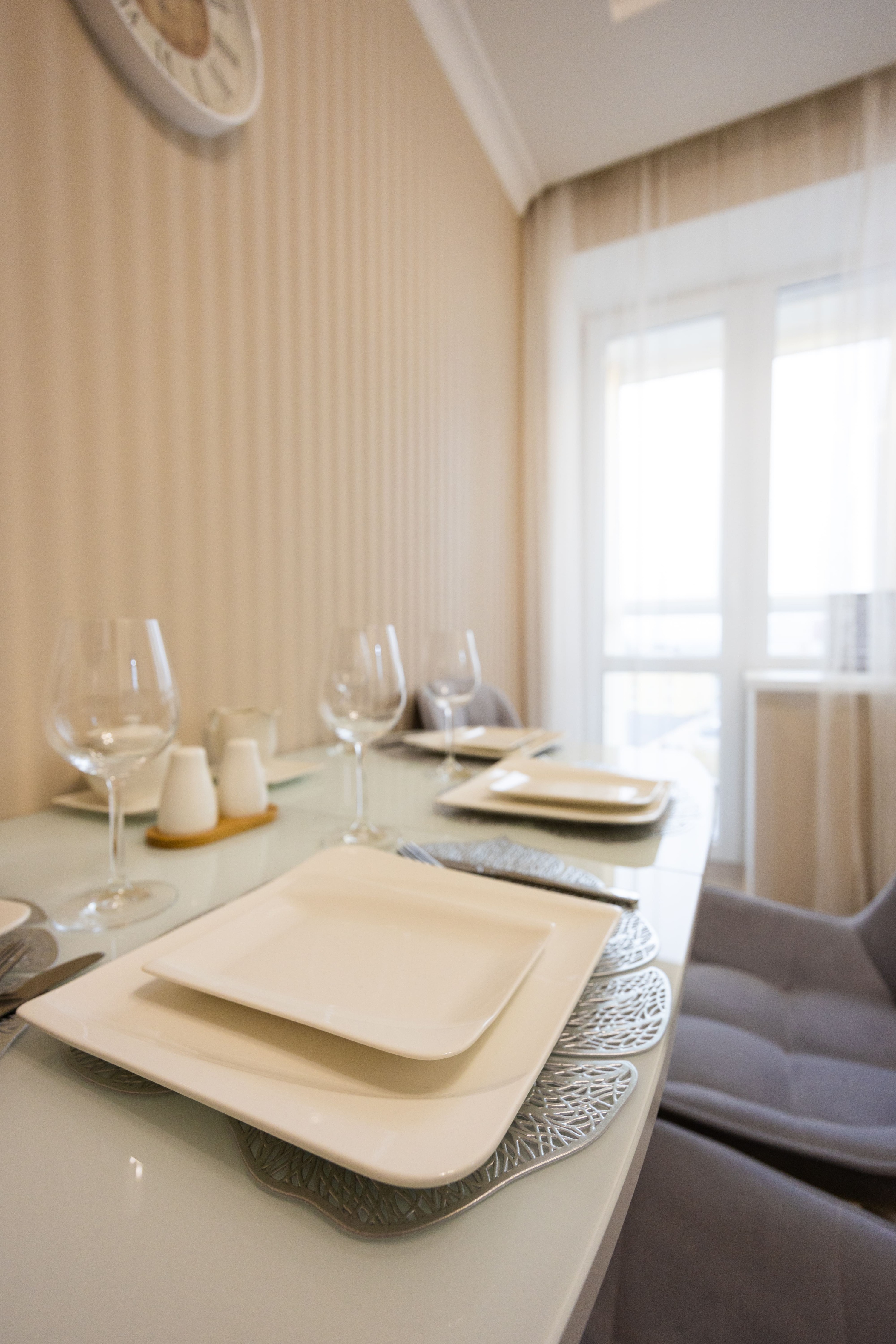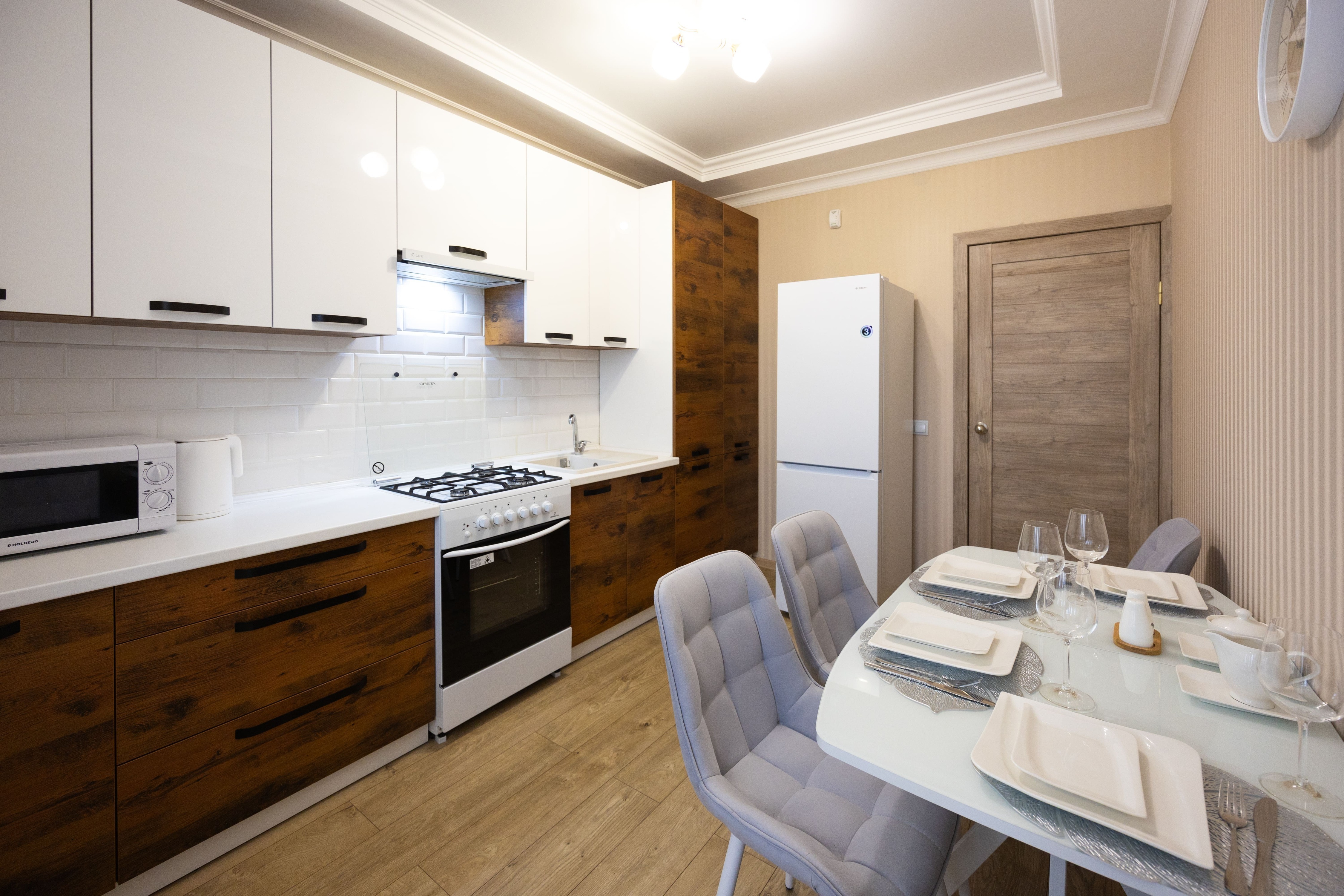 - Кухня со всем необходимым (холодильник, плита, духовка, вытяжка, микроволновая печь, чайник, а так же посуда и приборы)