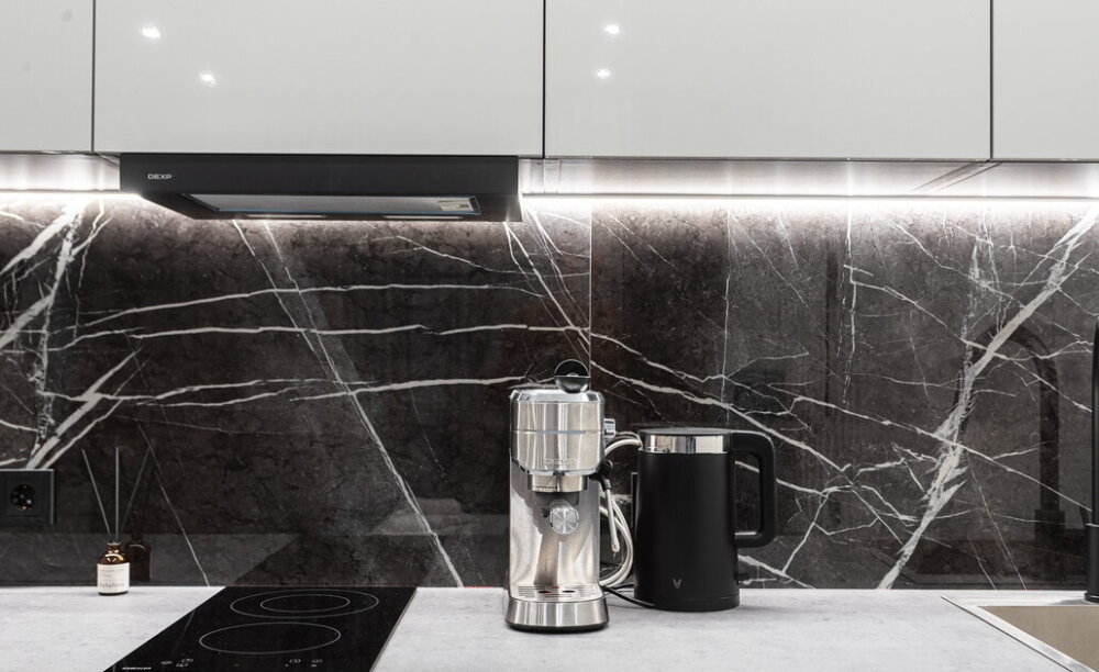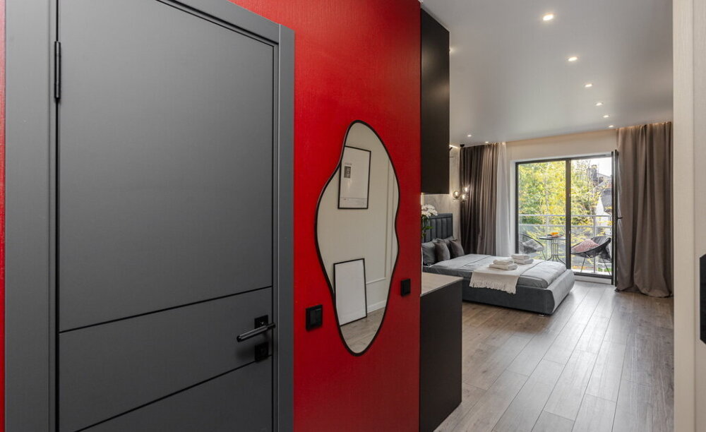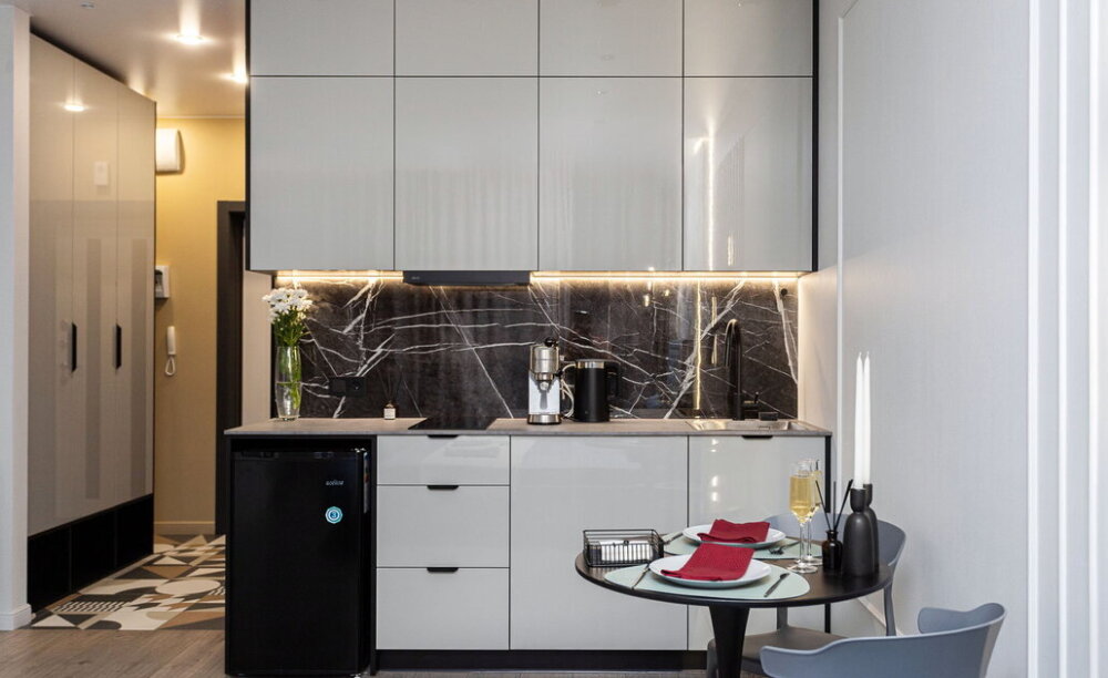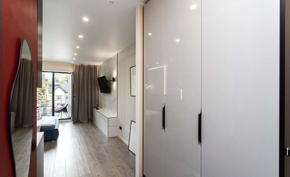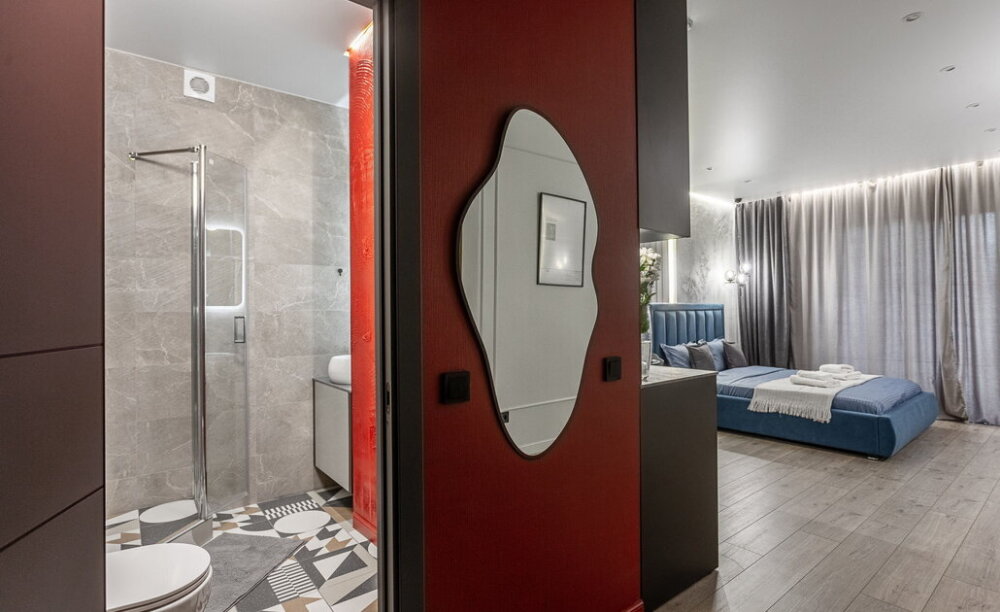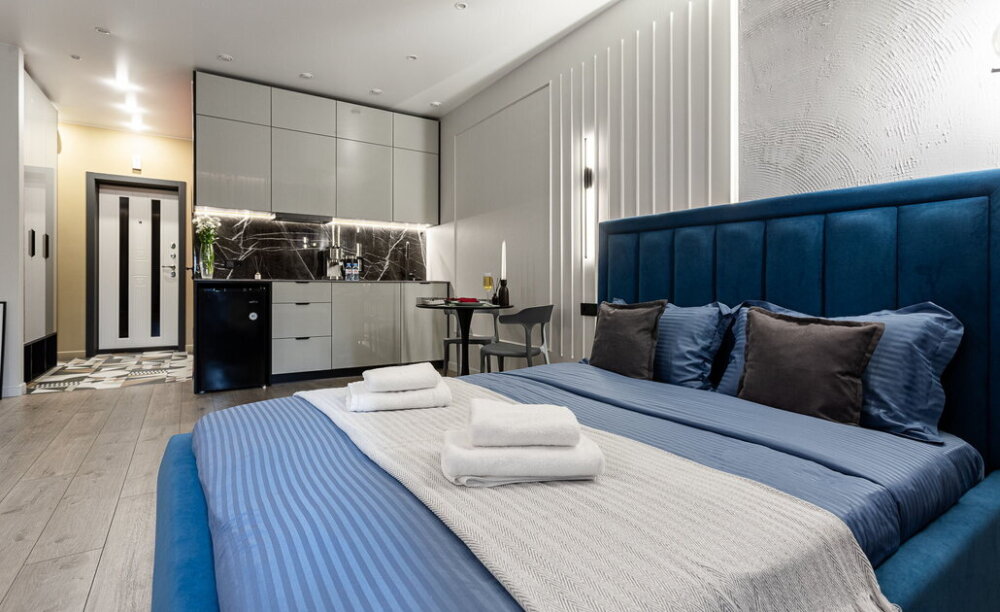 В апартаментах возможно размещение 2 гостей. Бытовая техника: варочная поверхность, холодильник, чайник, рожковая кофемашина, стиральная машина, Smart TV. Для вещей: большой функциональный шкаф, предусмотрено место чемодана. Для сна: большая двуспальная кровать 160х200 с ортопедическим матрасом и хлопковым постельным бельём. Для банных процедур: душевая зона с тропическим душем, зеркало со встроенной подсветкой, инсталляция с подвесным унитазом, электрический полотенцесушитель. А также полотенца, халаты (по запросу), все необходимые средства гигиены и по уходу за телом.