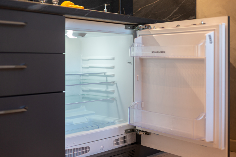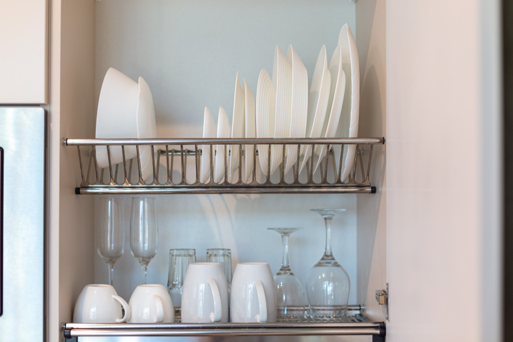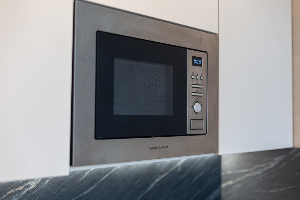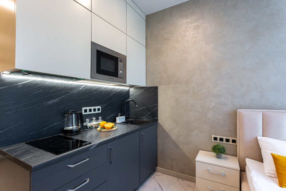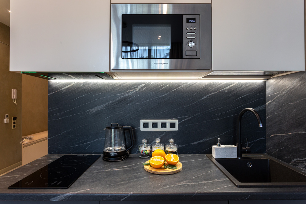 Кухня: с холодильником, варочной поверхностью, вытяжкой, мойкой, микроволновой печью, чайником, посудой