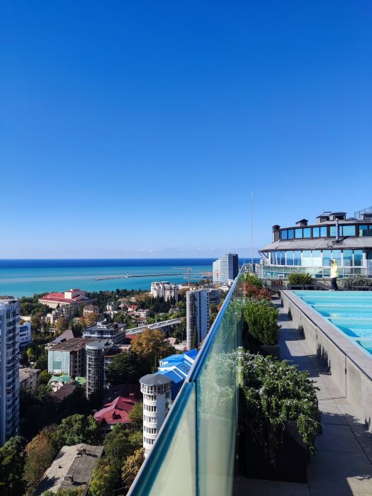 Эксплуатируемая крыша с бассейном, душевыми и лежаками, спортивными тренажерами и спортивной площадкой.