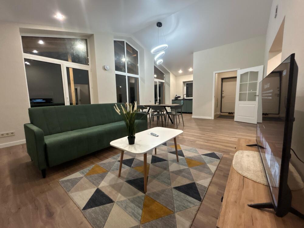 - просторная гостиная с панорамными окнами, обеденной зоной и удобным диваном (140х200)