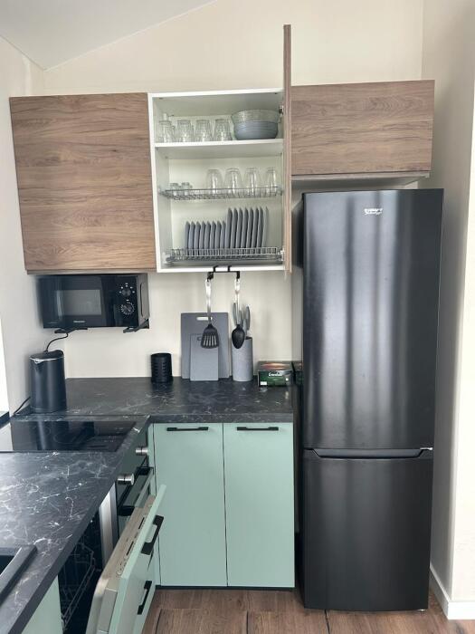 - полноценная кухня, полностью укомплектована посудой и техникой: холодильник, варочная панель, духовка, посудомойка, СВЧ, кофеварка и чайник.